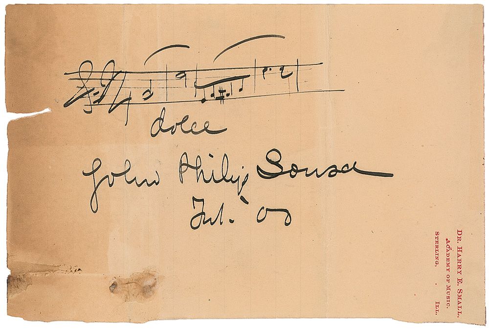 AMQS on an off-white sheet of Dr. Harry Small’s Academy of Music stationery, 7.25 x 5, signed “John Philip Sousa, Feb. ‘00.” Sousa pens three bars of music from an unidentified work, notating underneath “dolce.” Two vertical creases, one each through a single letter of signature, scattered toning, heavier to the left edge, a couple small edge tears, trimmed bottom edge, and show-through from adhesive on reverse, otherwise very good condition. Sousa’s quote and signature remain very prominent and bold.