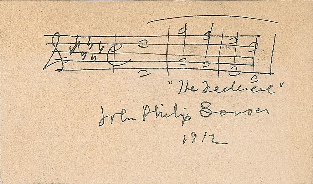 AMQS, signed “John Philip Sousa, 1912,” on an off-white 3.5 x 2.25 card. Sousa pens three bars from “The Federal,” which he titles below. Light overall toning, mild soiling, a bend to the upper edge, and mounting remnants to reverse from previous display