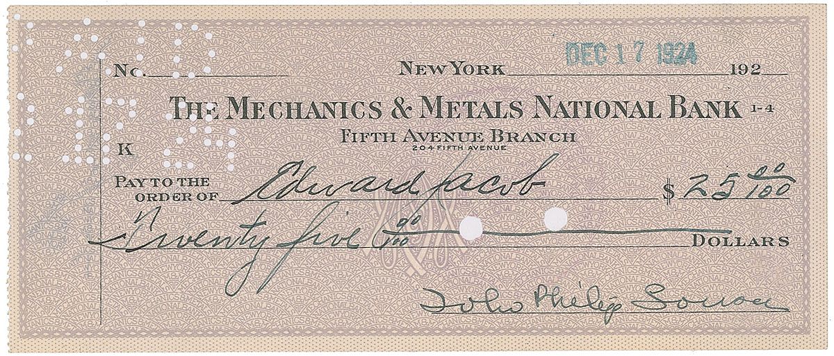 Bank check, 6.5 x 2.75, filled out in another hand and signed by Sousa, “John Philip Sousa,” payable to Edward Jacob for $25, stamp-dated December 17, 1924. In fine condition, with a faint vertical fold and expected cancellation holes. Accompanied by a letter of transmittal from his daughter and the original mailing envelope.