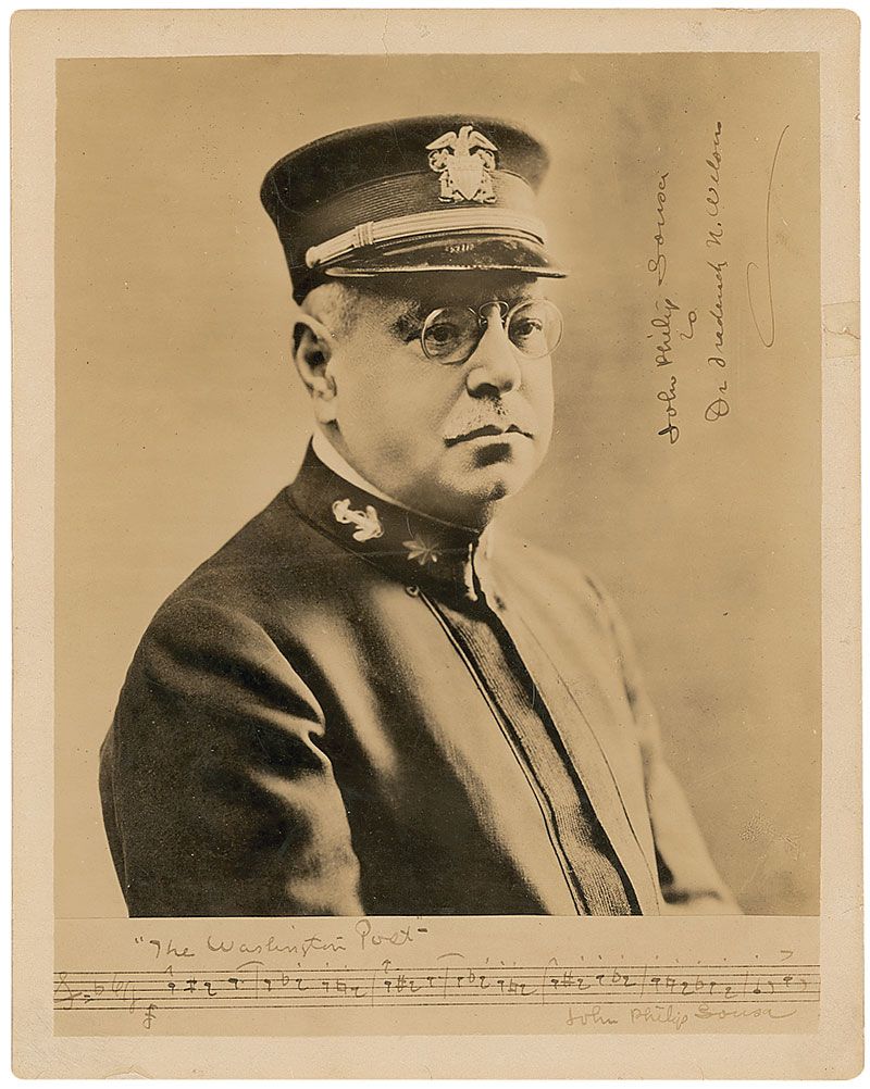 Striking vintage glossy 8 x 10 portrait of Sousa in his bandmaster uniform, signed and inscribed vertically in fountain pen “John Philip Sousa to Dr. Frederick N. Wilson.” Printed along the bottom are seven bars of ‘The Washington Post’ and a facsimile signature. In very good condition, with light scattered creases, a central horizontal crease, repaired tear to right border, central tear to top border, a few other border dings, and silvering to dark areas of the image.