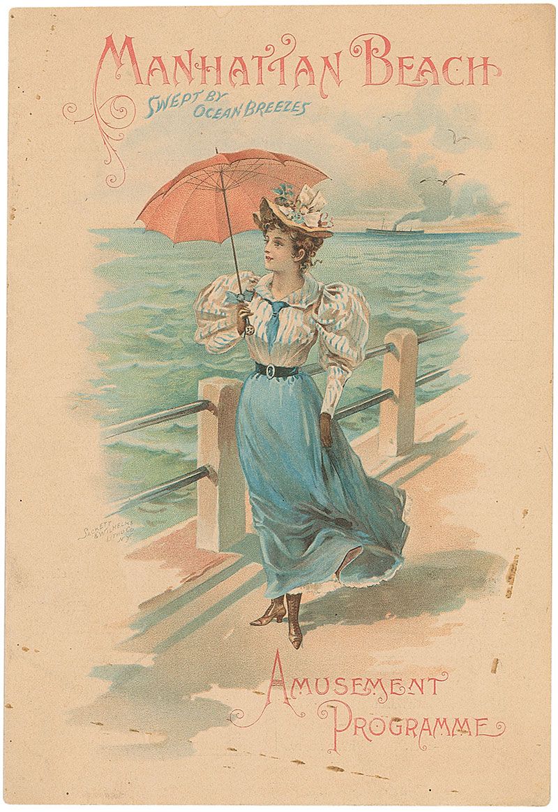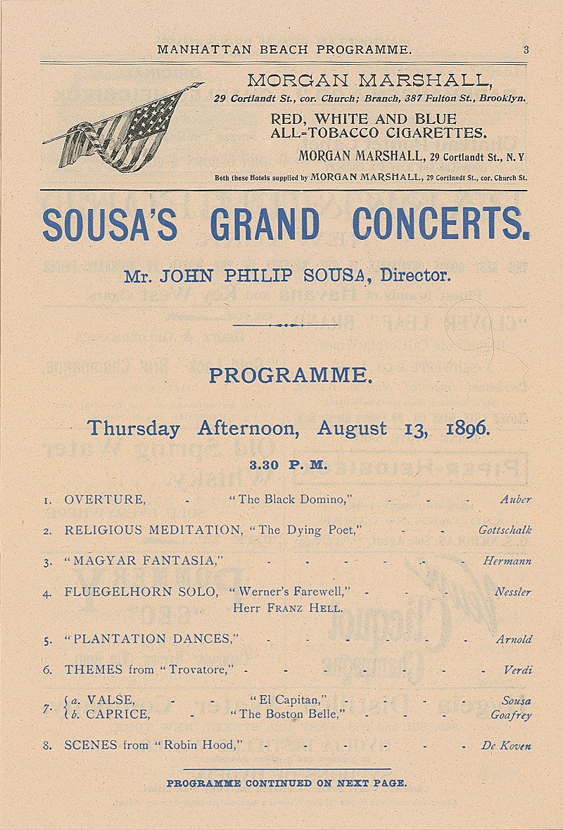 Unsigned “Manhattan Beach Amusement Programme,” 6.75 x 10, 17 pages, with two pages featuring the concert program for “Sousa’s Grand Concerts” on August 13, 1896. Scattered toning and soiling to the cover, and a light central vertical bend, otherwise fine condition.