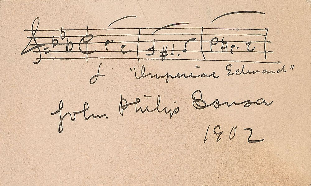 AMQS on an off-white 4 x 2.5 card. Sousa pens three bars from ‘Imperial Edward,’ signed underneath the quote, “John Philip Sousa 1902.” Two shades of over all toning, otherwise fine condition.