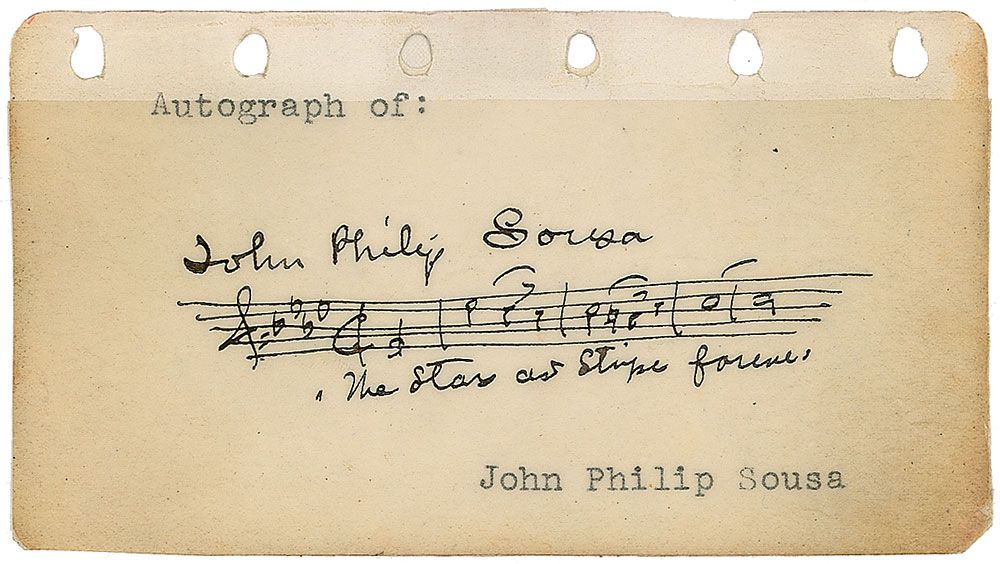 AMQS on an off-white 4.5 x 2.5 page, Sousa pens four bars of music to his classic ‘Stars and Stripes Forever,’ signing above the quote, “John Philip Sousa.” Some mild toning from an old applied laminate, otherwise fine condition.