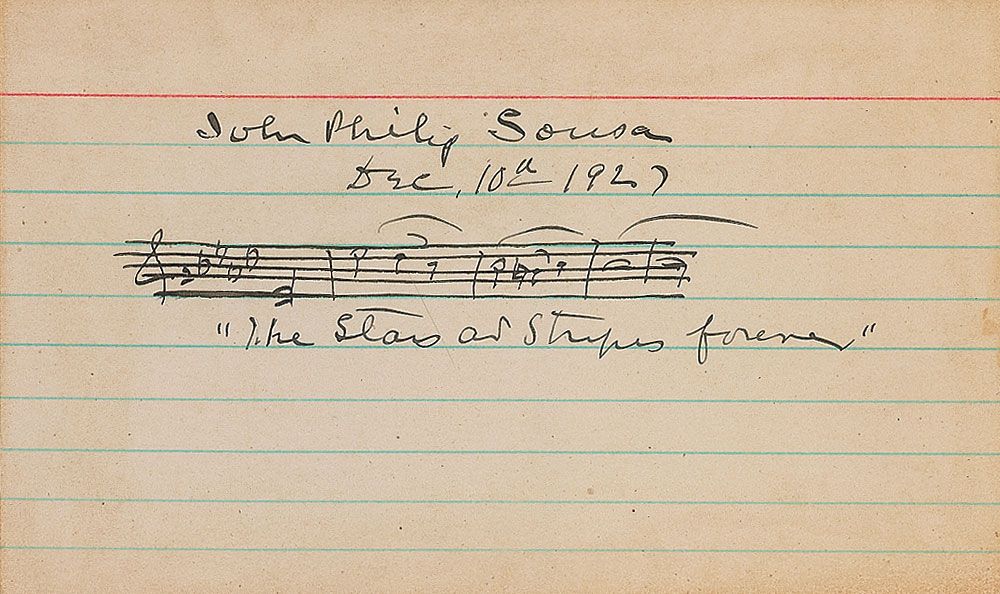 Highly desirable AMQS on an off-white 5 x 3 lined card, signed in black ink, “John Philip Sousa, Dec. 10th 1927.” Sousa pens five bars of the patriotic march considered his magnum opus, “The Stars and Stripes Forever,” adding the title below. Some overall toning and soiling, otherwise fine condition.