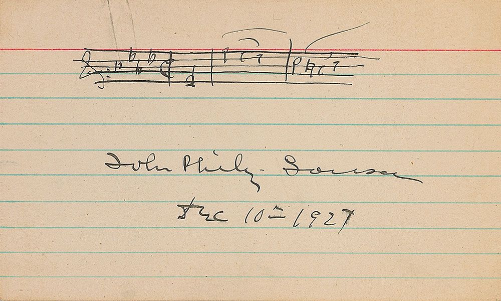 Highly desirable AMQS on an off-white 5 x 3 lined card, signed in black ink, “John Philip Sousa, Dec. 10th 1927.” Sousa pens five bars of the patriotic march considered his magnum opus, ‘The Stars and Stripes Forever.’ In fine condition, with mild overall toning and a paperclip impression to the upper left.