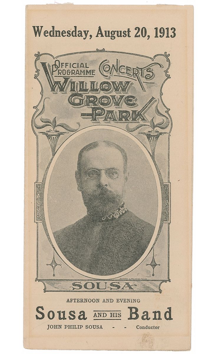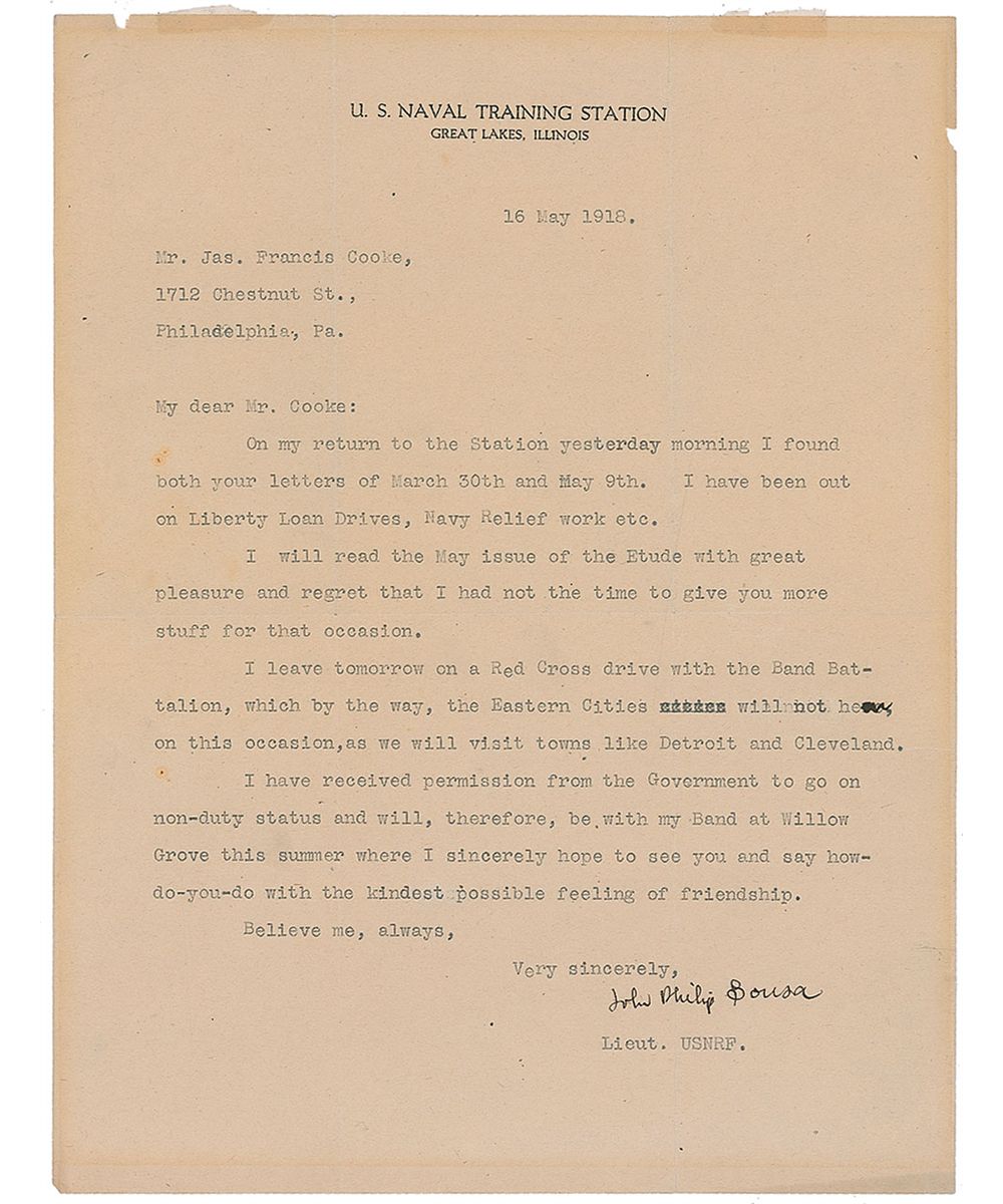 TLS, one page, 8 x 10.5, US Naval Training Station letterhead, May 16, 1918. Letter to James Francis Cooke. In part: “I have been out on Liberty Loan Drives, Navy Relief work, etc. I will read the May issue of the Etude with great pleasure and regret that I had not the time to give you more stuff for that occasion. I leave tomorrow on a Red Cross drive with the Band Battalion, which by the way, the Eastern Cities will not be here on this occasion, as we will visit towns like Detroit and Cleveland. I have received permission from the Government to go on non-duty status and will, therefore, be with my Band at Willow Grove this summer where I sincerely hope to see you and say how-do-you-do with the kindest possible feeling of friendship.” Accompanied by an original program from Sousa’s August 20, 1913, concert at the Willow Grove Park. Intersecting folds, one through a single letter of signature, a few edge tears and creases, and mild toning to borders, otherwise fine condition.
