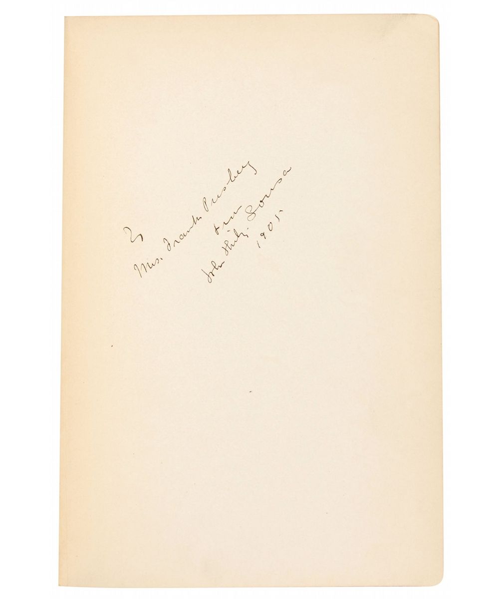 Signed book: Pipetown Sandy. First edition. Indianapolis: Bobbs-Merrill Company, 1905. Hardcover, 5 x 7.5, 383 pages. Signed and inscribed on the first free end page, “Mrs. Frank Presbey from John Philip Sousa 1905.” Autographic condition: fine. Book condition: VG/None.