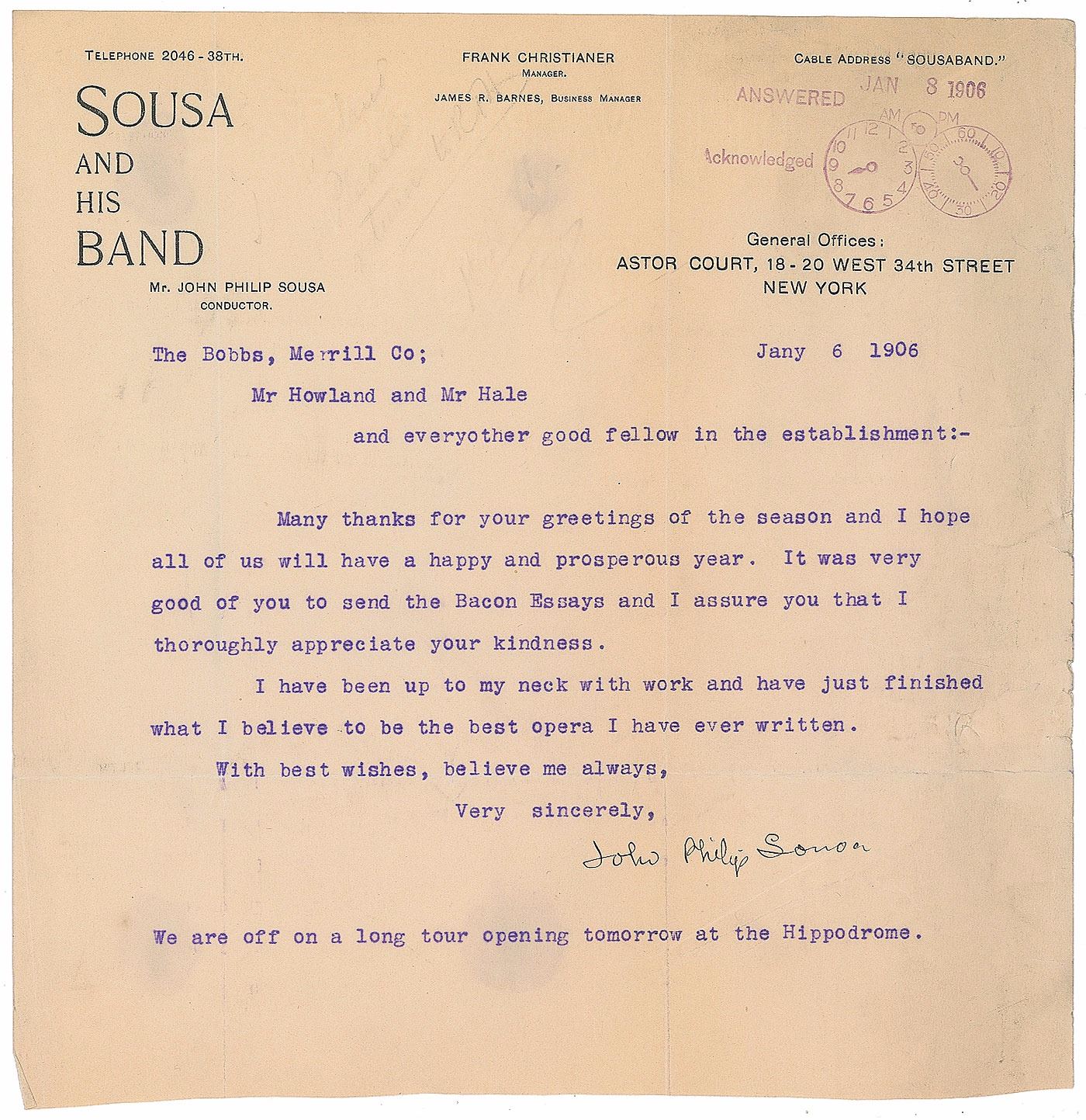 TLS, one page, 8.5 x 8.5, Sousa and His Band letterhead, January 6, 1906. Letter to the Bobbs, Merrill Co., in full: "Many thanks for your greetings of the season and I hope all of us will have a happy and prosperous year. It was very good of you to send the Bacon Essays and I assure you that I thoroughly appreciate your kindness. I have been up to my neck with work and have just finished what I believe to be the best opera I have ever written." Sousa adds a brief postscript: "We are off on a long tour opening tomorrow at the Hippodrome." In very good to fine condition, with trimmed edges and light show-through from old mounting residue on the reverse.