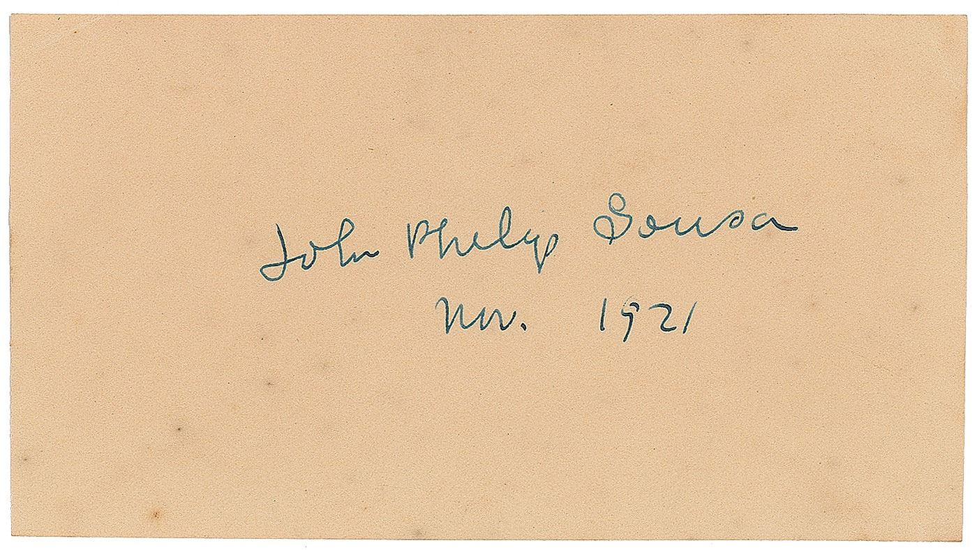 Bold ink signature, "John Philip Sousa, Nov. 1921,” on an off-white 5.25 x 2.75 card. In fine condition, with faint overall foxing. Accompanied by the original mailing envelope, postmarked November 28, 1921.