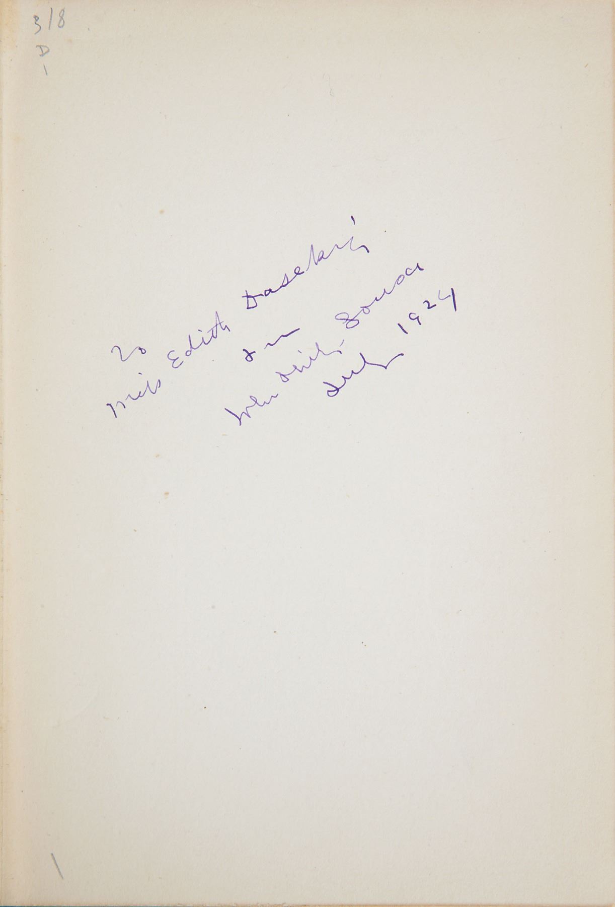 Signed book: The Transit of Venus. First edition. Boston, MA: Small, Maynard & Company, 1920. Hardcover, 5 x 7.5, 250 pages. Signed and inscribed on the first free end page in purple ink, "To Miss Edith Daseking, from, John Philip Sousa, July 1924." In fine condition.