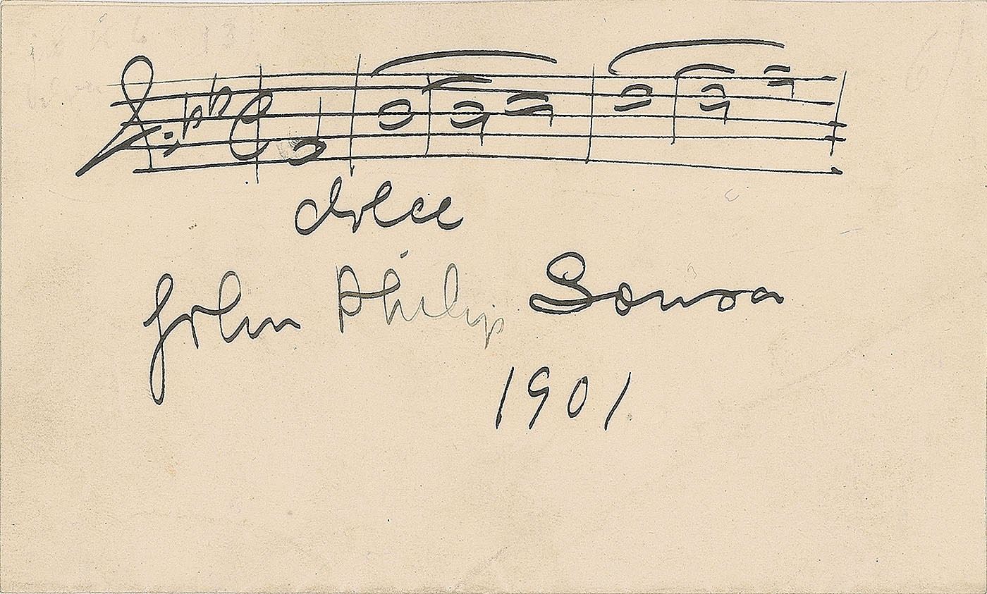 AMQS on an off-white 5.25 x 3 sheet, signed below in black ink, "John Philip Sousa, 1901," who pens four bars of music from an unidentified titled work, adding below, "dolce." In fine condition, with scattered light creasing.