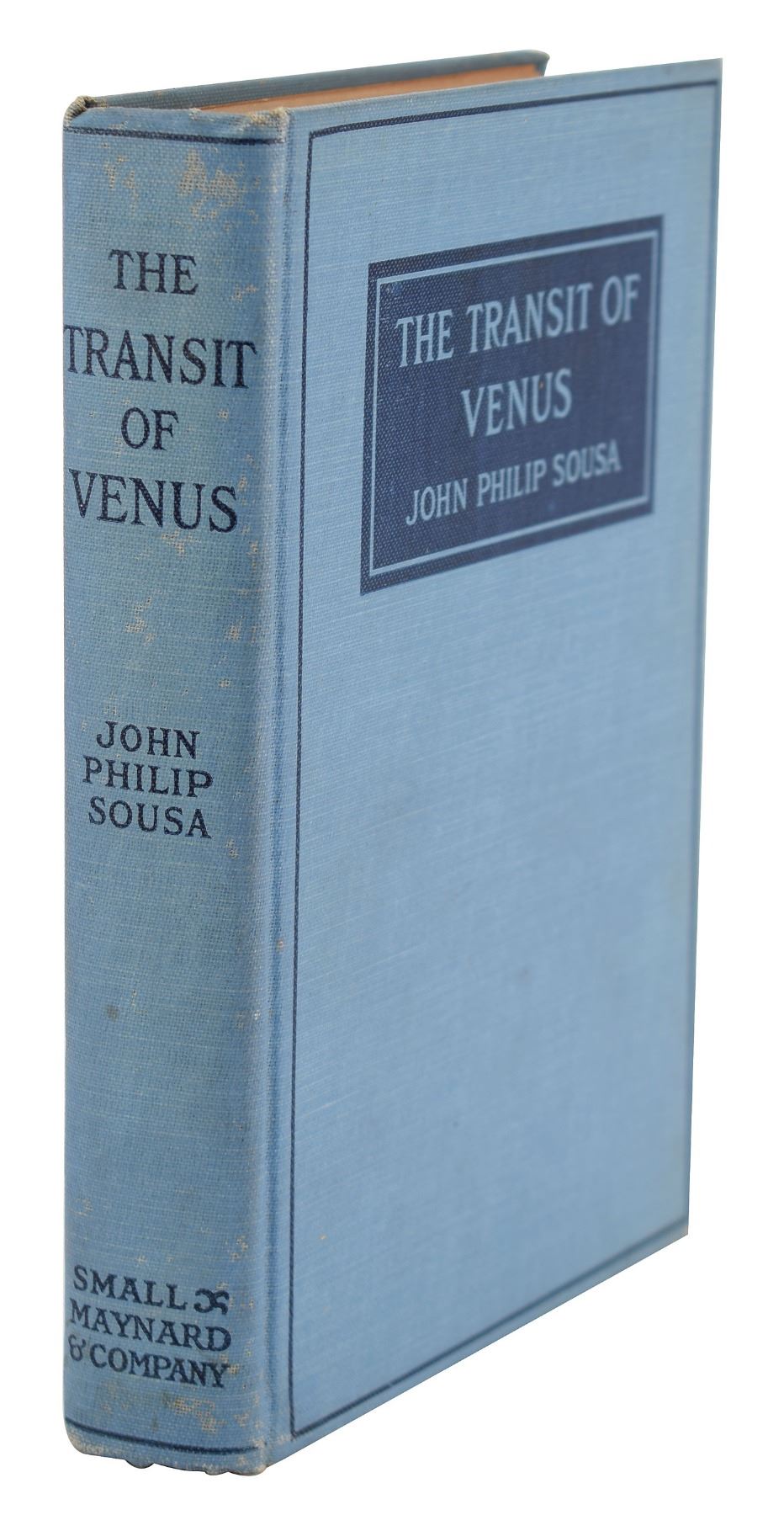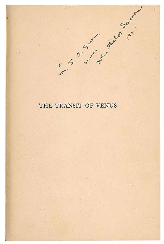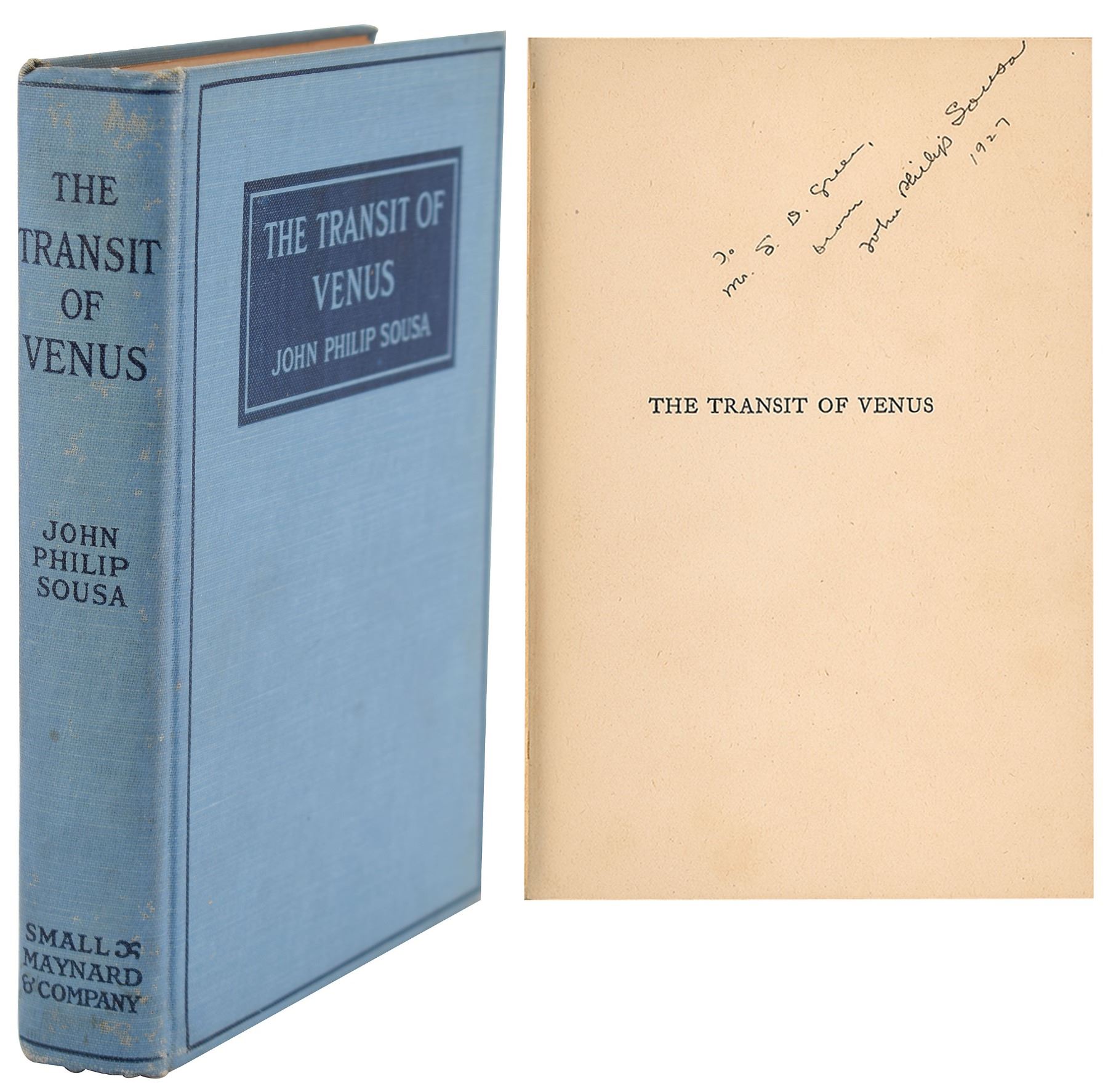 Signed book: The Transit of Venus. First edition. Boston, MA: Small, Maynard & Company, 1920. Hardcover, 5.25 x 7.75, 250 pages. Signed and inscribed on the half-title page in black ink, "To Mr. S. D. Green, from, John Philip Sousa, 1927." In fine condition, with light scuffing to the spine, and light separation along the front hinge.