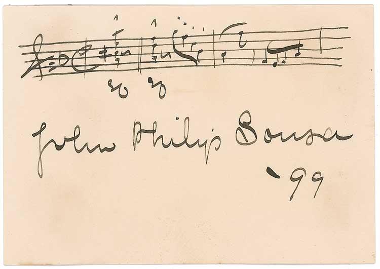 AMQS on an off-white 3.25 x 2.5 card. Sousa pens three bars of music from an unidentified work, signing underneath, “John Philip Sousa ‘99.” In fine condition, with a bit of light uniform overall toning and rippling from mounting remnants on reverse. Pre-certified PSA/DNA and RRAuction COA.