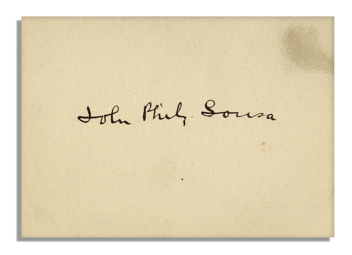 Slip signed, ''John Philip Sousa'' in black ink. Sousa is known for his expert conducting of marching bands, and in particular for the National March of the United States, ''The Stars and Stripes Forever''. He also invented a proprietary brass instrument, the sousaphone. Accompanied by the original envelope in which the autograph was mailed, along with the returned fan letter requesting it. Envelope is postmarked 23 June 1930. Slip measures 3.5'' x 2.5''. Light stain to upper right corner, else near fine.