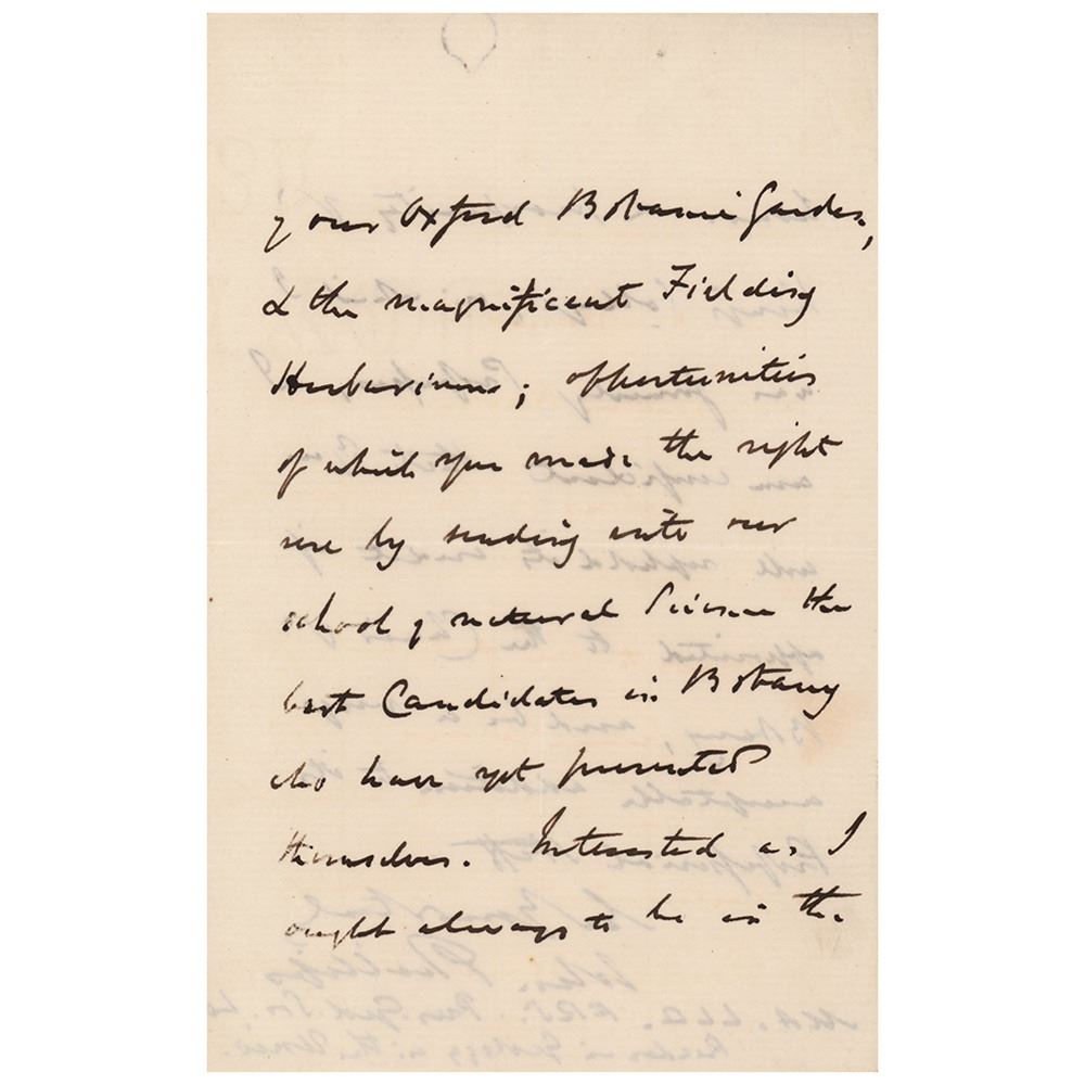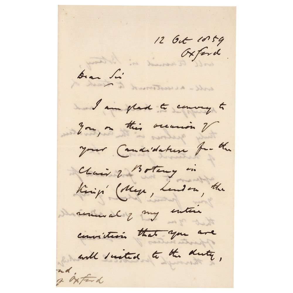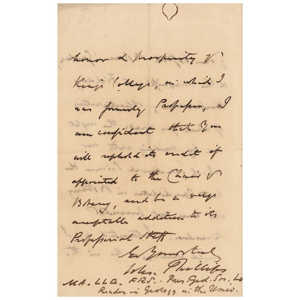 English geologist (1800–1874) who published the first global geologic time scale based on the correlation of fossils in rock strata, thereby helping to standardize terminology including the term 'Mesozoic,' which he created. ALS signed “John Phillips, MA, LLD, FRS, Pres. Geol. Soc. Lond., Reader in Geology in the Univ. of Oxford,†four pages on two adjoining sheets, 4.5 x 7, October 12, 1859. Handwritten letter to English botanist and taxonomist Maxwell T. Masters, in part: "I am glad to convey to you, on this occasion of your Candidature for the Chair of Botany in King's College, London, the renewal of my entire conviction that you are well suited for the duty, well trained in Botany, well-accustomed to teach & successful in teaching, and truly zealous in the cultivation of natural science. It appears to me fortunate for your future plans of life that you had such admirable opportunities of acquiring a thorough practical knowledge of our Oxford Botanic Garden, & the magnificent Fielding Herbarium." In fine condition, with a rusty circular paperclip impression to the top.