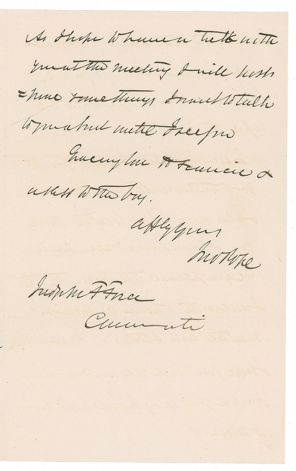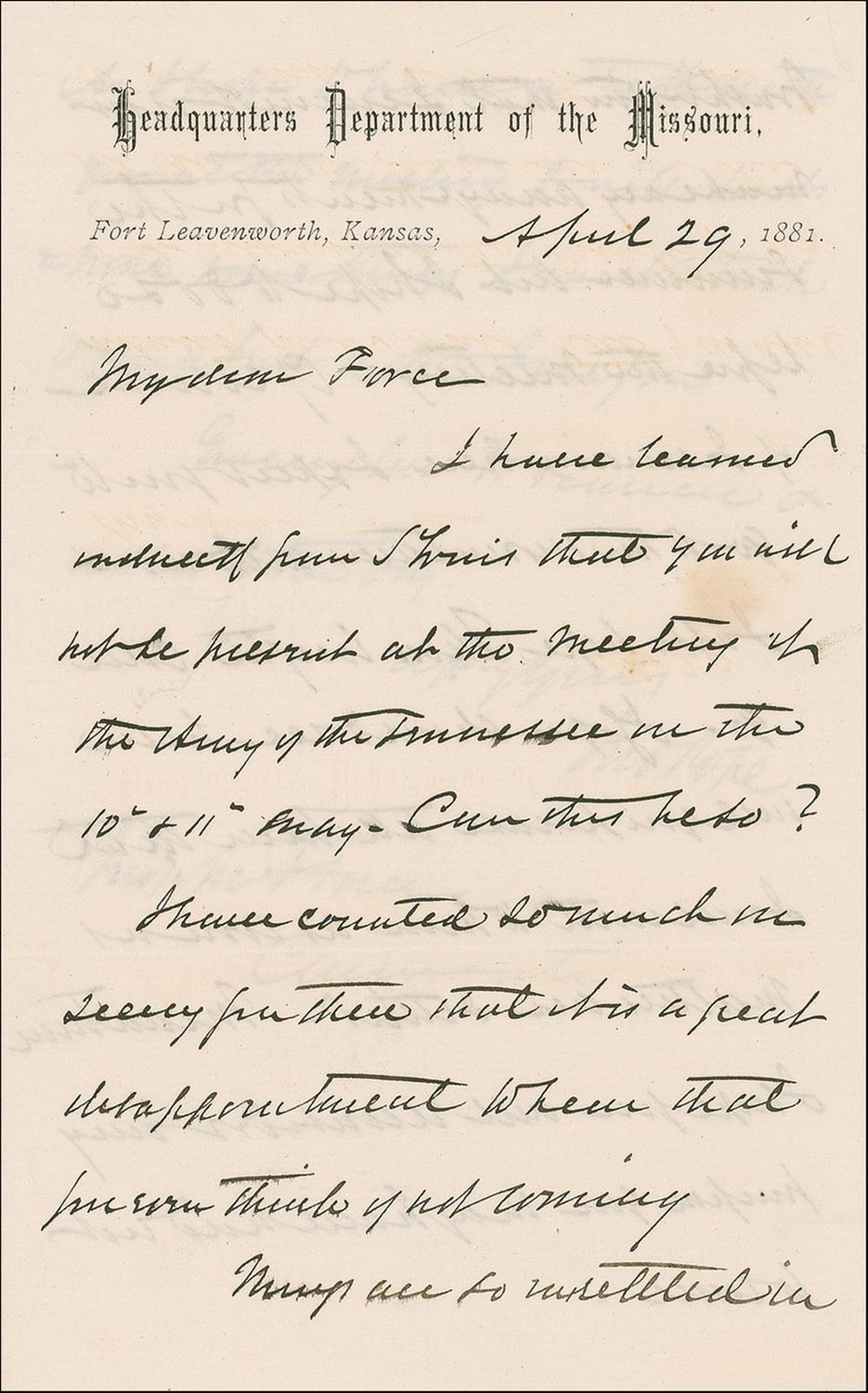 Kentucky-born Union general (1822–1892) who led the Army of the Mississippi in a campaign that opened the great river nearly to Memphis. His failures after the Peninsular Campaign and at Second Bull Run in August 1862 precipitated his replacement by General George McClellan. ALS signed “Jno Pope,” three pages on two adjoining sheets, 5 x 8, Headquarters, letterhead, April 29, 1881. Letter to Judge Manning F. Force, in part: “I have learned indirectly from someone that you will not be present at the meeting of the Army of the Tennessee on the 10th & 11th May. Can this be so. I have counted so much on seeing you there that it is a great disappointment to hear that you even think of not coming. Things are so unsettled in Washington that I cannot now make any arrangements for the summer but I hope to do so before the meeting. Of course, if I remain here I expect you to go to the mountains with us & I also hope…Wright can go. If you should see him will you please tell him that I will write to him as soon as matters are settled. Meantime I hope you will reconsider any purpose you may have had not to come. As I hope to have a talk with you at the meeting I will postpone something I want to talk to you about.” In fine condition, with a couple spots of trivial toning.