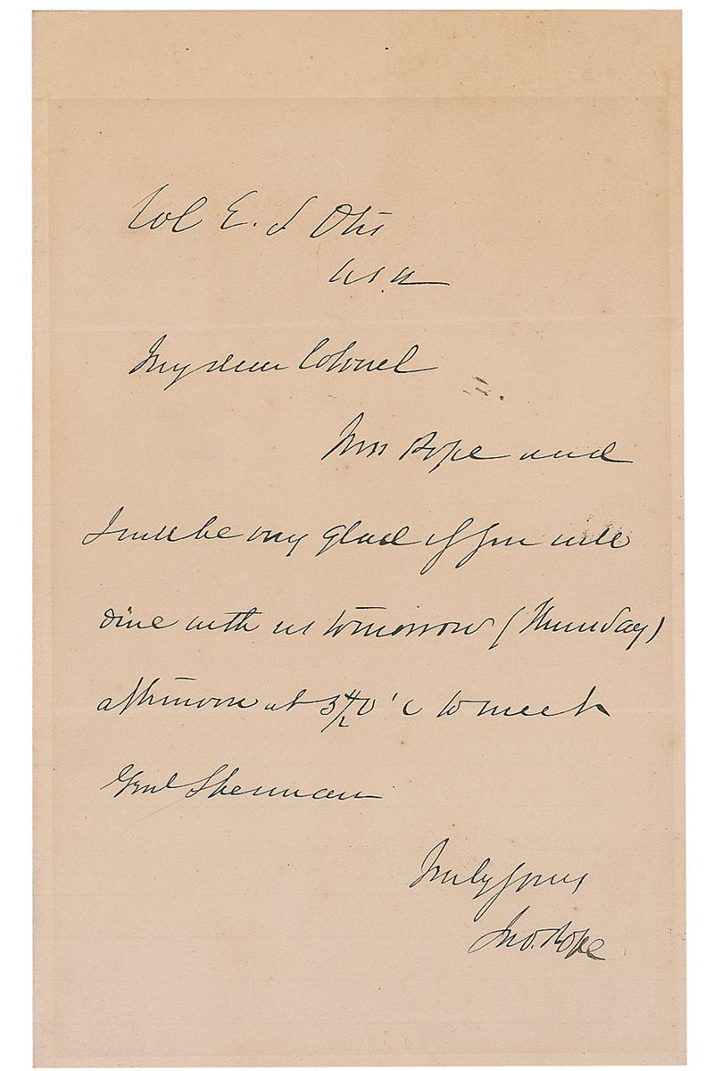 Kentucky-born Union general (1822–1892) remembered for his defeat at the Second Battle of Bull Run. ALS signed “Jno. Pope,” one page, lightly-lined, 5 x 8, no date. Letter to Colonel E. S. Otis. In full: “Mrs. Pope and I will be very glad if you will dine with us tomorrow (Thursday) afternoon at 3 1/2 o’c to meet Gen’l Sherman.” In fine condition, with a light block of toning over the letter from previous display. Accompanied by an unsigned engraved portrait of Pope bearing a pre-printed signature.