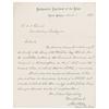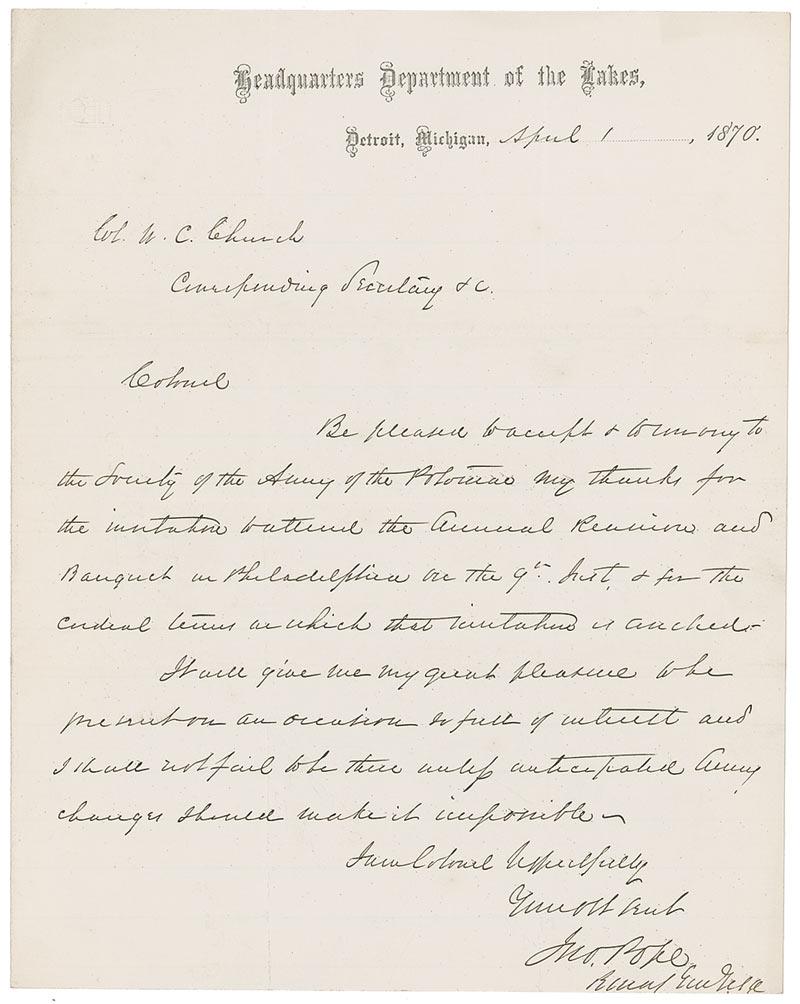 Kentucky-born Union general (1822–1892) who led the Army of the Mississippi in a campaign that opened the great river nearly to Memphis. His failures after the Peninsular Campaign and at Second Bull Run in August 1862 precipitated his replacement by General George McClellan. ALS signed “Jno. Pope,” one page, 8 x 10, Headquarters Department of the Lakes letterhead, April 1, 1870. Pope accepts an invitation from journalist William Conant Church. In part: “Be pleased to accept & to convey to the Society of the Army of the Potomac my thanks for the invitation to attend the Annual Reuinon and Banquet…It will give me my great pleasure to be present …” In fine condition, with intersecting folds.