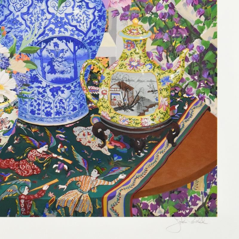 "Peonies" is a limited edition serigraph on paper by John Powell, numbered 9/300 and hand signed by the artist. Includes Letter of Authenticity. Measures approx. 29" x 38" (border), 24" x 32" (image).