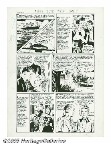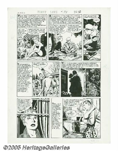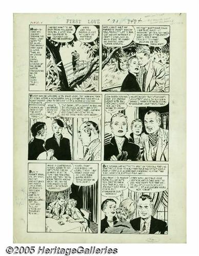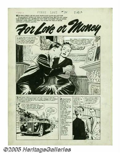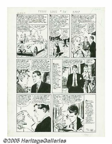 <B>John Prentice (attributed) - First Love #71 Complete 5-page Story "For Love or Money" Original Art (Harvey, 1956).</B></I> John Prentice brought the style and grace of his "Alex Raymond School" art approach to this love-triangle melodrama. The first two pages of this story were drawn on illustration board, while the other pages were drawn on bristol paper. The image area of each page measures 12" x 18" and the art is in Excellent condition.