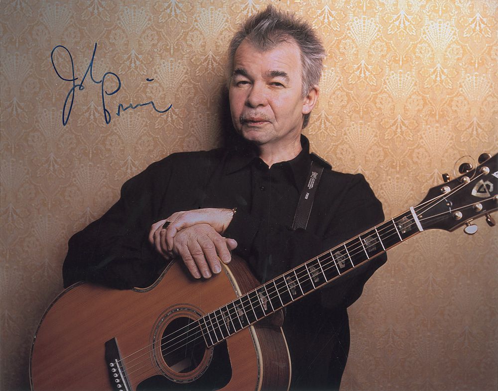 Color glossy 14 x 11 photo of Prine posing with an acoustic guitar, signed in blue felt tip. In fine condition.