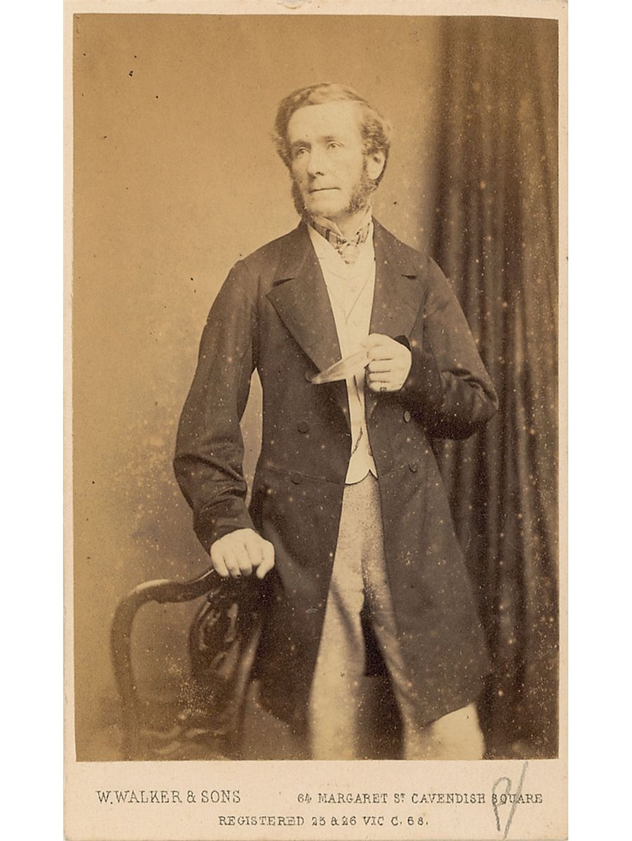 Original 2.25 x 4 three-quarter length carte-de-visite photo by W. Walker and Sons of London, signed on the reverse in black ink. In fine condition, with light spotting to image, a couple dings to top edge, and a pencil notation along top edge of reverse.