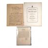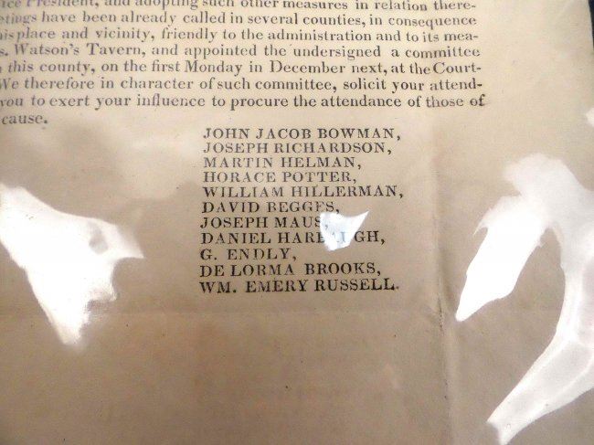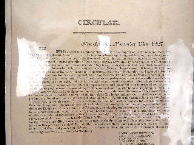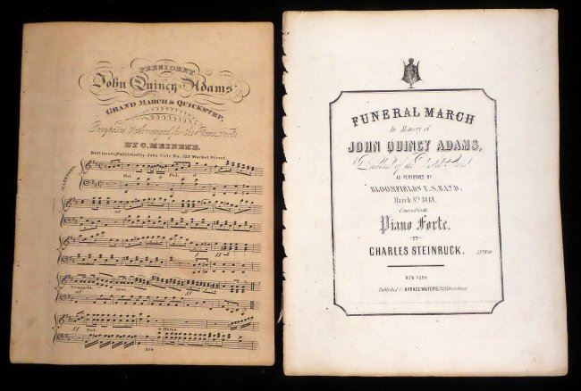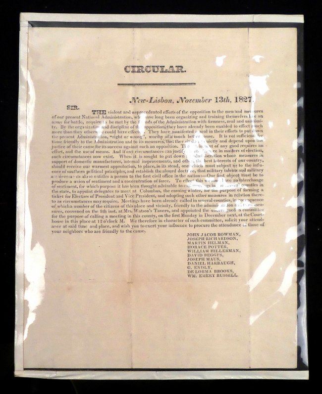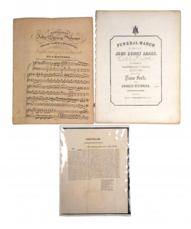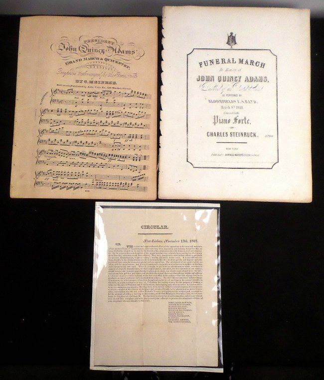 Half page, printed 4to, circular broadside with header "New-Lisbon November 13th, 1827". A call to form a ticket for electors of president and vice-president. Signed in type by eleven gentlemen. Toning, fold wear and some smudges. Accompanied by sheet music titled "President John Quincy Adams Grand March & Quickstep" by O. Meinkeye [large 4to, 3 pages] and "Funeral March in Memory of John Quincy Adams, President of the United States" by Charles Steinruck [large 4to, 2 pages]. Toning, fold wear, and some smudges.