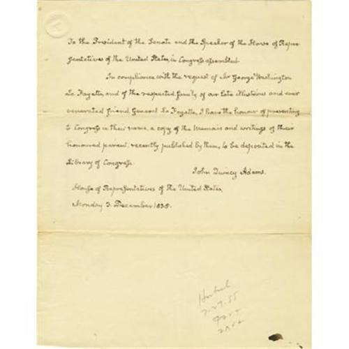 <B>John Quincy Adams Autograph Letter Signed in full.</B></I> One page, 7.75" x 9.75", Washington , December 3, 1838, to the President of the Senate and the Speaker of the House of Representatives of the United States to inform them of the deposit of General Lafayette's memoirs at the Library of Congress. Adams writes: "...<I>In compliance with the request of Mr. George Washing La Fayette, and of the respected family of our late illustrious and ever venerated friend, General La Fayette, I have the honour of presenting the congress in their name, a copy of the memoirs and writings of their honoured parent, recently published by them, to be deposited in the Library of Congress.</B></I>" A wonderful association piece. Light folds, else fine condition. <I>Ex. Henry E. Luhrs Collection.</B></I><BR><BR><BR><b>Shipping:</b> Flat Material, Small (<a target="_blank" href="http://www.heritageauctions.com/common/shipping.php">view shipping information</a>)