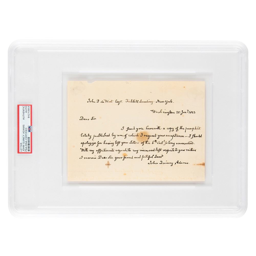 ALS, one page, 7.5 x 5.5, January 25, 1823. Handwritten letter as Secretary of State, in full: "I send you herewith a copy of the pamphlet lately published by me, of which I request your acceptance—I should apologize for having left your Letter of the 6th inst. so long unanswered. With my affectionate regards to my niece, and best respects to your mother. I remain Dear Sir, your friend and faithful Serv't." In fine condition, with scattered stains, a small edge chip, and light show-through from old mounting remnants on the back corners. Encapsulated in a PSA/DNA authentication holder.