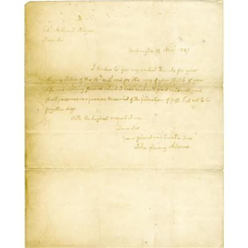 <B>John Quincy Adams Autograph Letter Signed to War of 1812 Hero Arthur P. Hayne</B></I> Good association ALS "<I>John Quincy Adams</B></I>", one page, 8" x 10", Washington, Nov. 19, 1847. He thanks Hayne for "<I>your sketch of your life and military services which I have read with great interest and shall preserve as a precious memorial of the Patriotism of past but not to be forgotten days.</B></I>" Hayne had served during the War of 1812 as a first lieutenant, major, and inspector general. His gallantry at the Battle of New Orleans earned him the rank of brevet lieutenant colonel. The letter has the usual mail folds, and uneven toning, somewhat darker at top fold and left margin. Ink has faded a bit but remains very legible; overall condition is good.<BR><BR><b>Shipping:</b> Flat Material, Small (<a target="_blank" href="http://www.heritageauctions.com/common/shipping.php">view shipping information</a>)