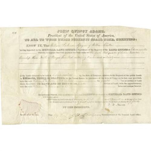 <B>John Quincy Adams As President Partially Printed Document Signed,</B></I> "<I>J. Q. Adams</B></I>"<I>,</B></I> one page on vellum, 14" x 9", Washington, D.C., December 1, 1825. This land grant entitles "<I>William Parkison Assignee of William Chilton... the North West Quarter of Section Seventeen in Township Three North of Range Six West containing one hundred and sixty acres</B></I>" in Edwardsville, Illinois. Countersigned by Commissioner of the General Land Office George Graham. Paper seal torn, light toning. Very good condition.<BR><BR><b>Shipping:</b> Flat Material, Small (<a target="_blank" href="http://www.heritageauctions.com/common/shipping.php">view shipping information</a>)