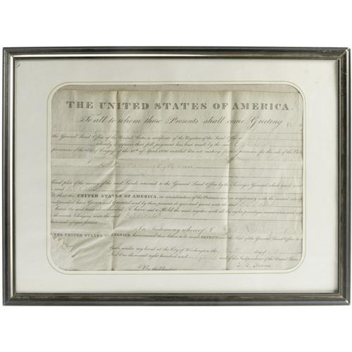 <B>John Quincy Adams Document Signed</B></I> "<I>J.Q. Adams.</B></I>" One page, 12" x 8.5", Washington D.C., March 15, 1827. This land grant was written for Eli Abbot of Dearborn County, Indiana. The grant reads in part, "<I>…it appears that full payment has been made by the said Eli Abbot according to the provisions of the Act of Congress of the 24th of April 1820 entitled 'An act making further provisions for the sale of the Public Lands' for the East half of the South West quarter of section twenty seven, in township Eleven North of Range nine East in the district of lands offered for sale at Indianapolis Indiana; Containing Eighty Acres…</B></I>" Adams signs this document in the lower right, as President of the United States, and it is countersigned by George Graham, Commissioner of the General Land Office. The 2.25" seal of the General Land Office is affixed at the left. The land grant is framed and matted. <BR><BR> The document is in fine condition; usual folds are present; soiling present on left and right edges; pencil marks visible in upper right corner.