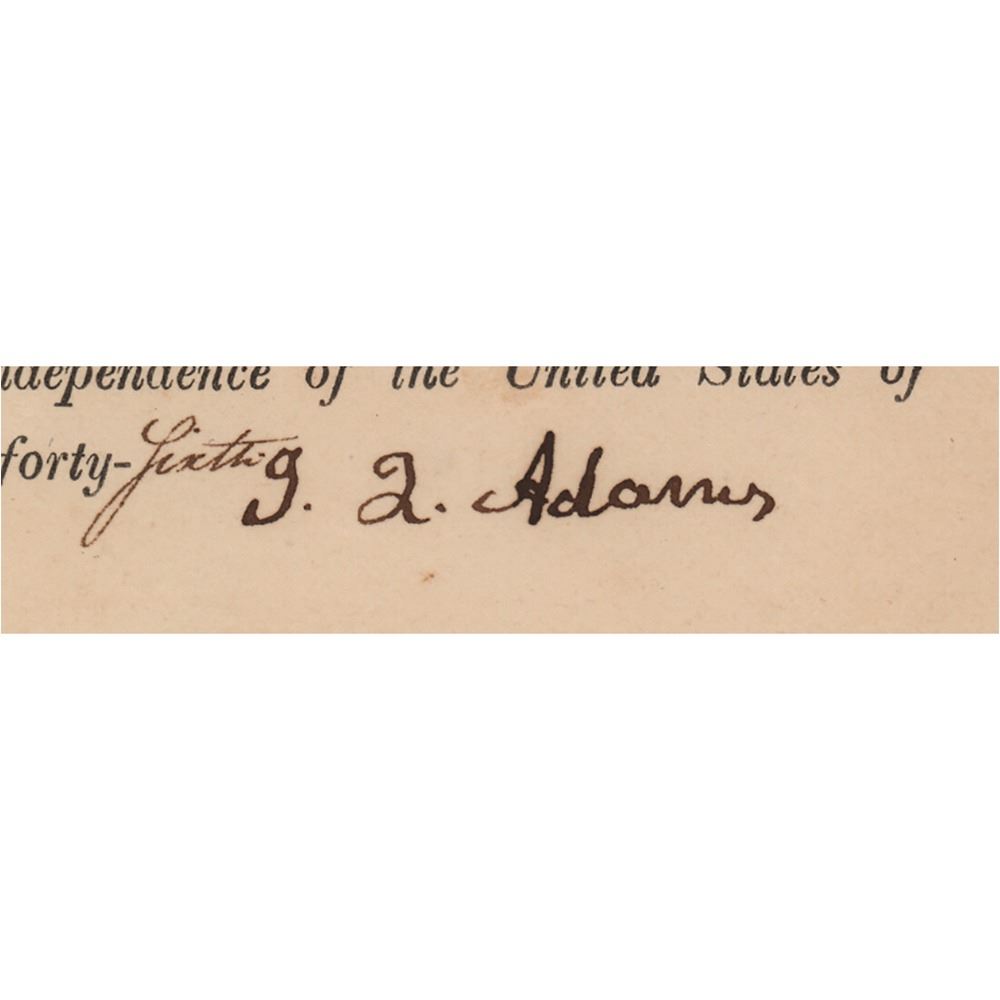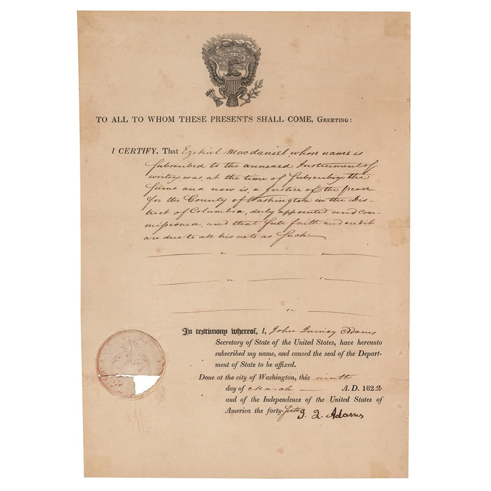 Partly-printed DS, signed “J. Q. Adams,†one page, 7 x 9.75, March 9, 1822. As secretary of state, John Quincy Adams certifies that "Ezekiel Macdaniel, whose name is subscribed to the annexed Instrument of writing, was, at the time of subscribing the same and now is, a Justice of the Peace for the County of Washington in the District of Columbia, duly appointed and commissioned." Signed boldly at the conclusion by Adams. In fine condition, with a portion of the embossed seal missing.