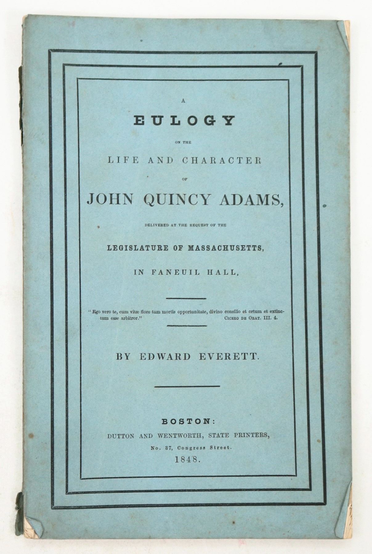A eulogy on the life and character of John Quincy Adams delivered at the request of the Legislature of Massachusetts in Faneuil Hall, by Edward Everett, April 15, 1848. 71 page pamphlet 6 x 9 inches. Published by Dutton and Wentworth of Boston. Pamphlet in very good condition with only minor folds at the corners. Everett was one of the great American orators of the antebellum and Civil War eras. He was the featured orator at the dedication ceremony of the Gettysburg National Cemetery in 1863, where he spoke for over two hours immediately before President Abraham Lincoln delivered his famous two-minute Gettysburg Address.