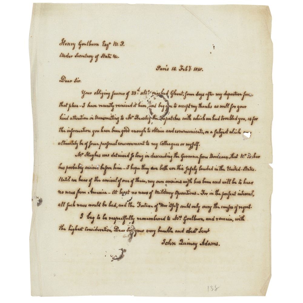 ALS, one page, 7.5 x 9, February 15, 1815. Original press copy of a letter from Paris to Under Secretary of State Henry Goulburn, referencing his departure from Ghent, where he had just negotiated the treaty that ended the War of 1812. In part: "Your obliging favour of 23d ulto. reached Ghent, some days after my departure from that place. I have recently received it here, and beg you to accept my thanks as well for your kind attention in transmitting to Mr. Beasley the dispatches with which we had troubled you, as for the information you have been good enough to obtain and communicate, on a subject which ultimately be of some personal concernment to colleagues and myself. Mr. Hughes was detained so long in descending the Garonne from Bordeaux, that Mr. Baker has probably arrived before him. I hope they are both ere this safely landed in the United States. Until we hear of the arrival of one of them, my own anxious wish has been and will be to hear no news from America. At least no news of military operations. For in the present interval, all such news would be bad, and the Fortune of War itself could only vary the causes of regret." In very good to fine condition, with scattered small areas of paper loss due to ink erosion. Christopher Hughes and Anthony St. John Baker were American and British secretaries to their respective legations during the Treaty of Ghent peace negotiations.