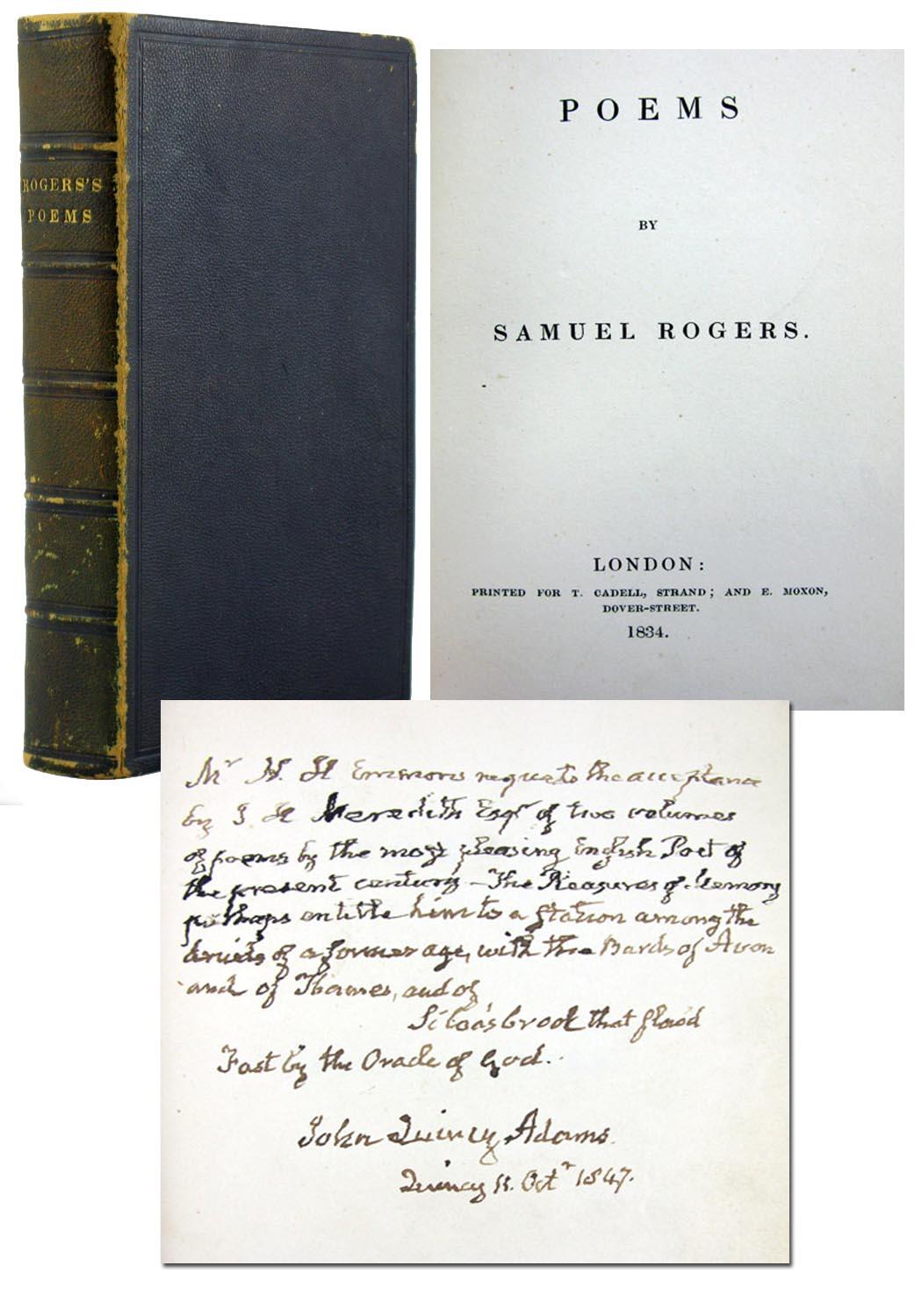 John Quincy Adams signed and inscribed copy of ''Poems'' by Samuel Rogers, published in 1834. Inscription by Adams, an amateur poet, on presentation leaf reads in part, ''...poems by the most pleasing English Poet of the present century. The Pleasures of Memory perhaps entitle him to a station among the druids of a former age, with the Bards of Avon and of Thames, and of Siloa's brook that flow'd. John Quincy Adams / Quincy 11. Octr 1847.'' Book measures 5'' x 8'' and runs 296pp., with some shelf wear. Very good condition.