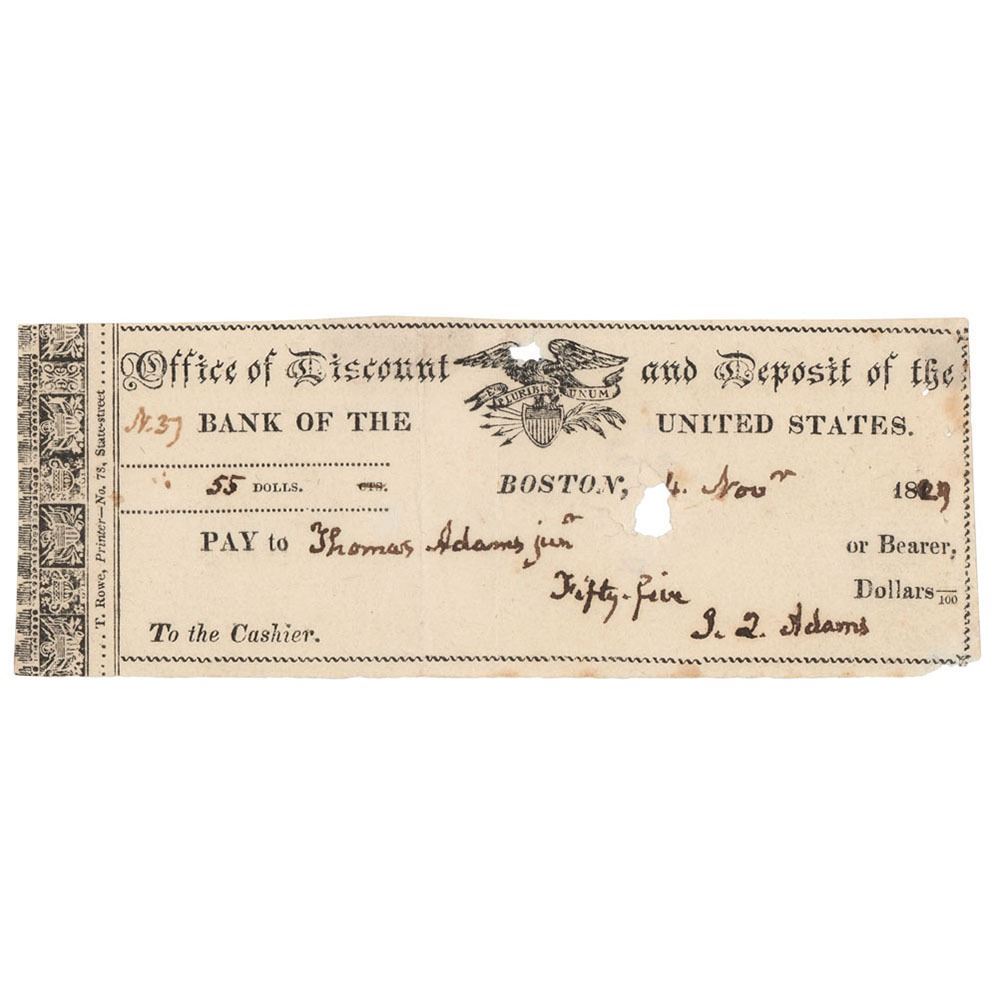 Office of Discount and Deposit of the Bank of the United States check, 5.75 x 2.25, filled out and signed by Adams, "J. Q. Adams," payable to "Thomas Adams jun'r" for $55, November 4, 1829. In fine condition, with two small holes.