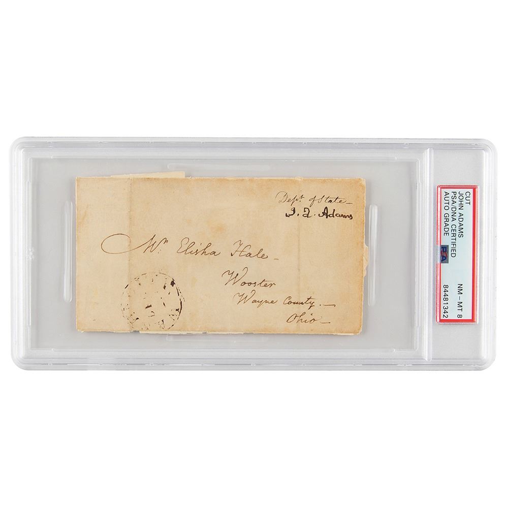 Free franked mailing panel, 5.5 x 3, addressed in another hand to "Mr. Elisha Hale, Wooster, Wayne County, Ohio," and franked in the upper right by John Quincy Adams as Secretary of State, "J. Q. Adams." In fine condition, with light soiling and toning. Encapsulated and graded by PSA/DNA as "NM-MT 8."