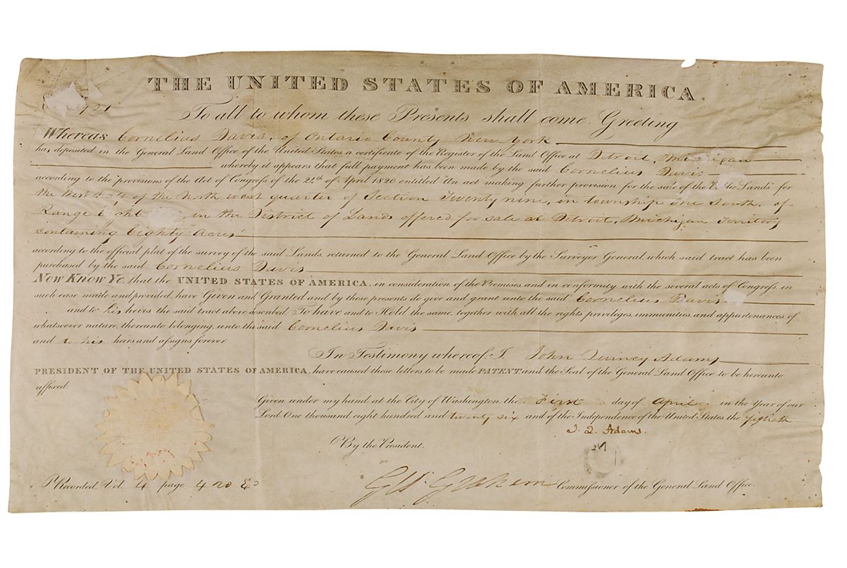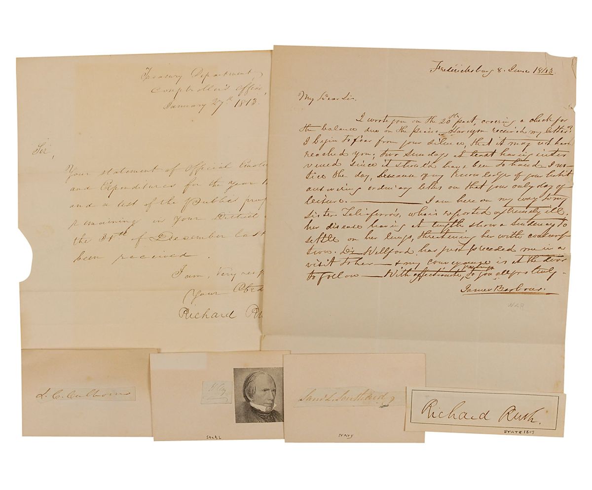 Partly-printed vellum DS as president, signed “J. Q. Adams,” one page, 15.5 x 9, April 21, 1926. President Adams grants Cornelius Davis a parcel of land “offered for sale at Detroit, Michigan containing eighty acres.” Document retains complete white paper seal to the lower left. In very good condition, with two vertical storage folds, overall wrinkling, light scattered foxing and soiling, and scattered mounting remnants to the front, affecting some of the main text. Adams’s signature remains unusually bold. Accompanied by six letters and slips, each signed by a member of his cabinet. Signers are: Henry Clay, John C. Calhoun, Richard Rush (2), Samuel L. Southard, and James Barbour. In overall very good to fine condition, with various folds, toning, soiling, and pencil notations.