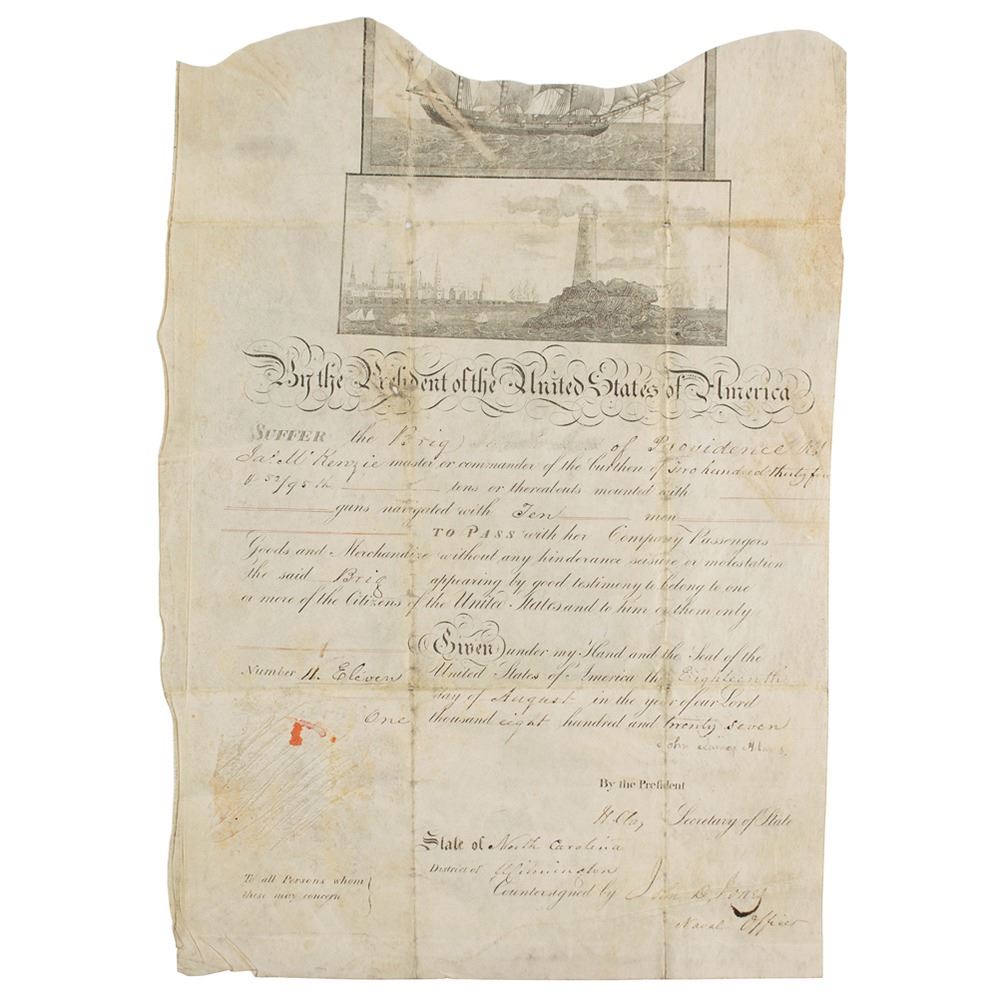 Partly-printed vellum DS, signed “J. Q. Adams" as president and "H. Clay" as secretary of state, one page, 10.5 x 15.25, August 18, 1827. Scallop-top ship's pass issued to "the Brig [scratched out] of Providence, R.I., Jas. McKenzie, master or commander of the burthen of two Hundred thirty five…tons or thereabouts…navigated with Ten men." Signed at the conclusion by President Adams and countersigned by Secretary of State Clay. In very good condition, with toning and soiling, small areas of vellum loss, a missing seal, and Adams' signature several shades light.
