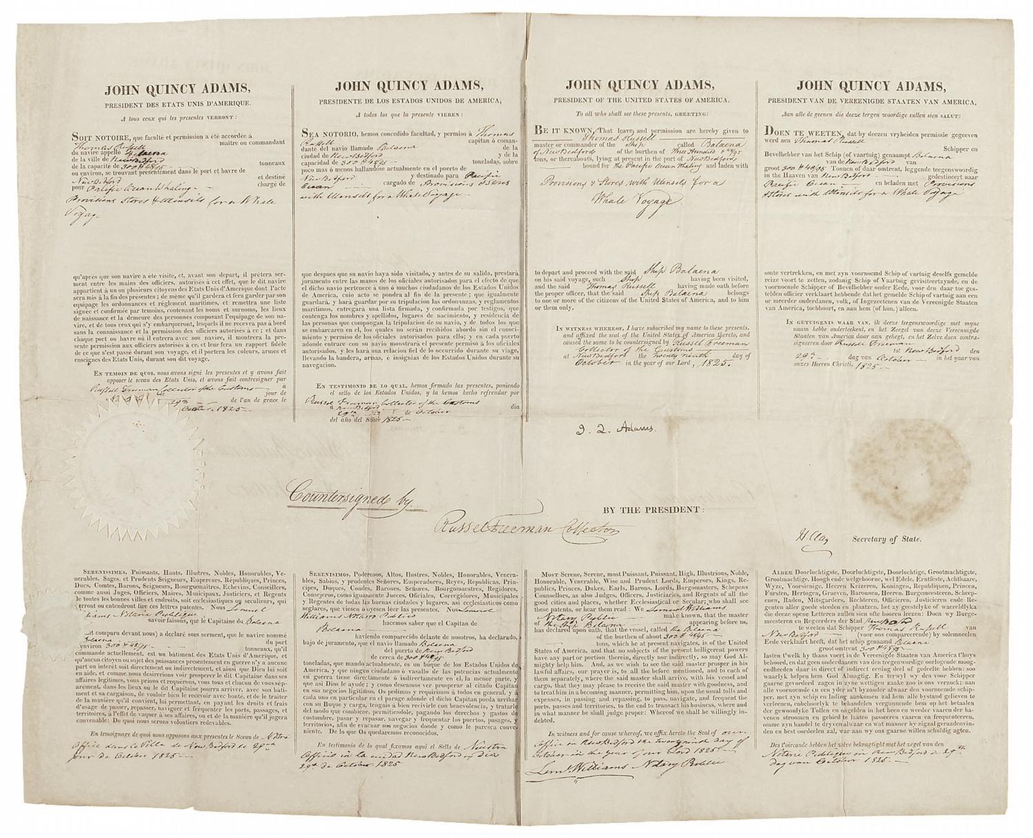Partly-printed DS, signed “J. Q. Adams,” as president and “H. Clay,” as secretary of state, one page, 20.25 x 16.25, October 29, 1825. A four-language ship’s papers issued to “Thomas Russell master or commander of the Ship called Balaena…lying at present in the port of New Bedford bound for Pacific Ocean, and laden with Provisions & Stores, with Utensils for a whale voyage.” Signed in the third panel by Adams, and countersigned by Secretary of State Henry Clay. Intersecting folds, partial separation along central vertical fold, with an old reinforcement to the same fold, scattered toning and soiling, mirroring of ink from folding, and scattered edge wear and creasing, otherwise very good condition. The white wafer seal is lightly toned but intact. Both signatures are largely unaffected by the document’s flaws. An uncommon pairing of two important politicians.