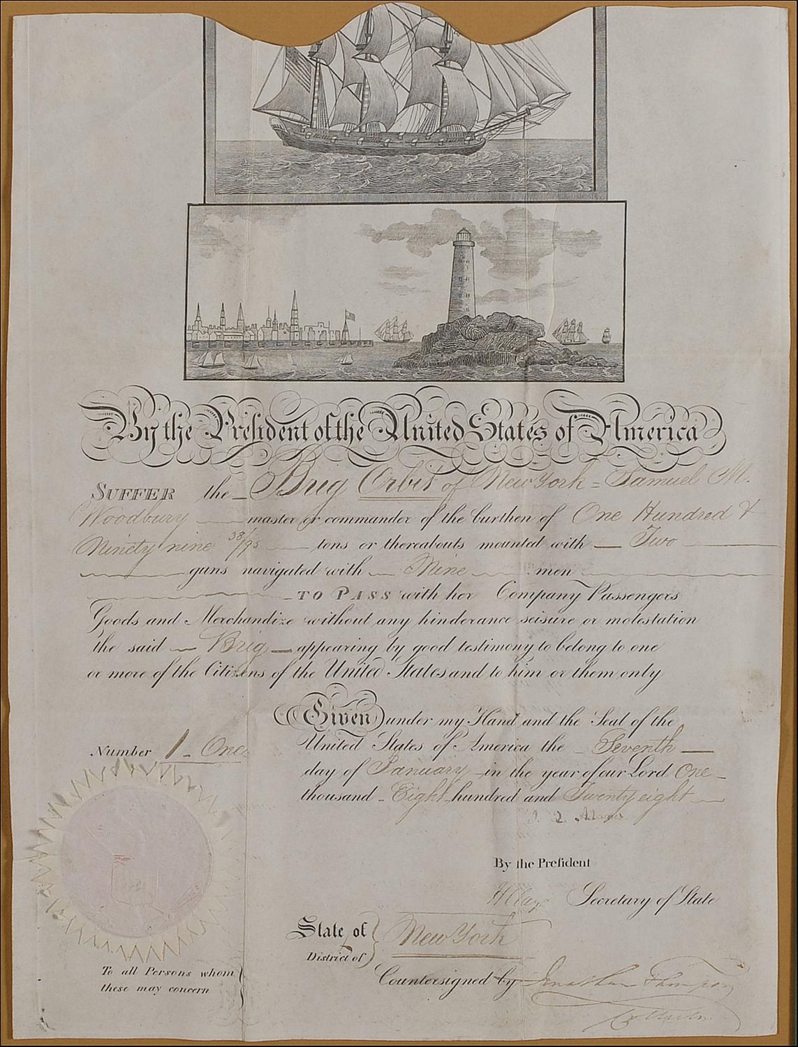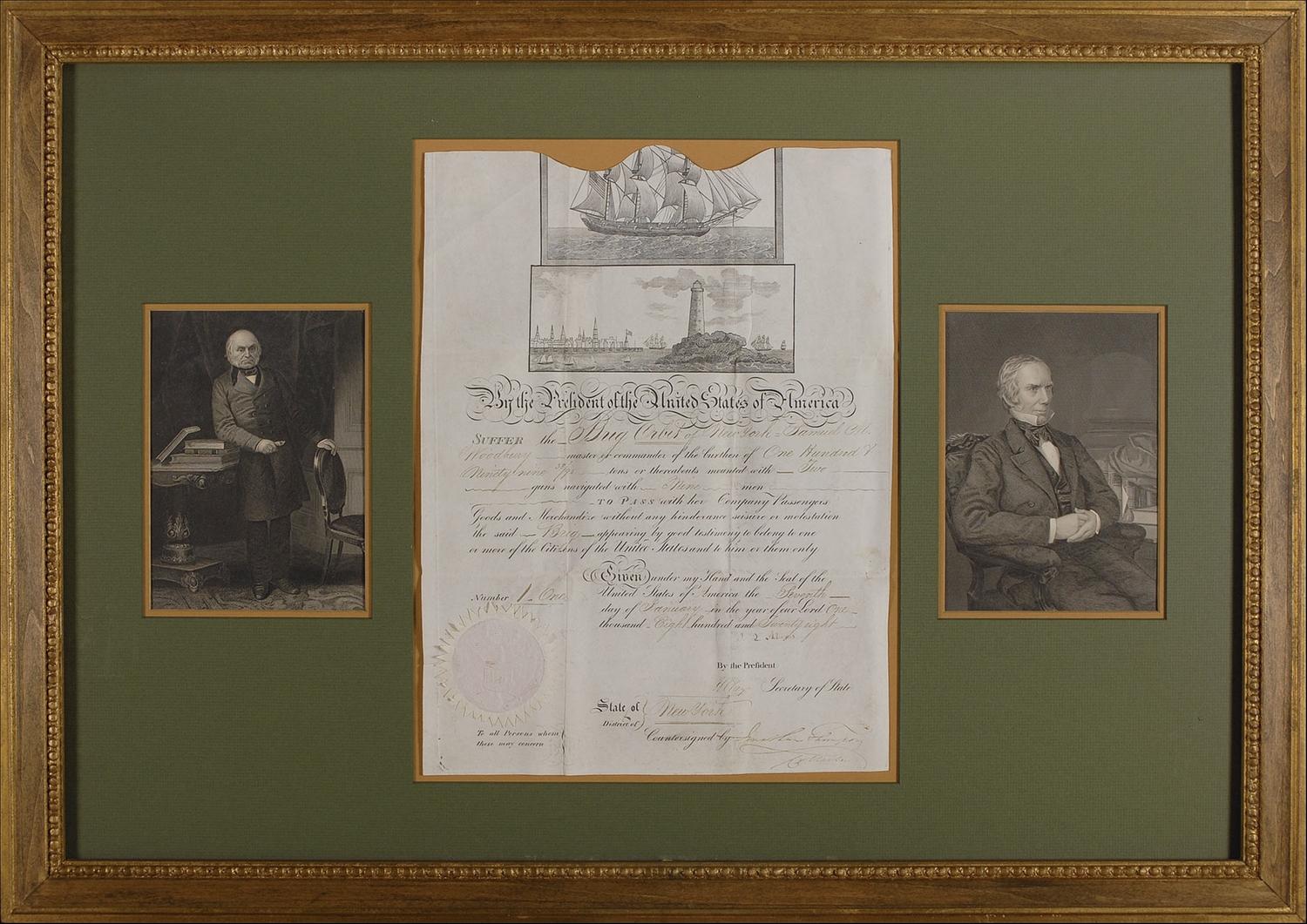 Scalloped-top vellum partly-printed DS, one page, 11 x 15, January 7, 1828. Ship’s pass issued to “the Ship Orbit of New York, Samuel M. Woodbury master and commander…mounted with two guns navigated with nine men.” Signed at the conclusion by Adams and countersigned by Clay. Document has been mounted and double matted and framed (no glass), with portraits of Adams and Clay, to an overall size of 31 x 22. In very good condition, with intersecting folds, one through a single letter of Clay’s signature, some scattered light soiling, Adams’s signature a shade or two light, but completely legible, and light mirroring of text. An uncommon pairing of two important politicians. Oversized.