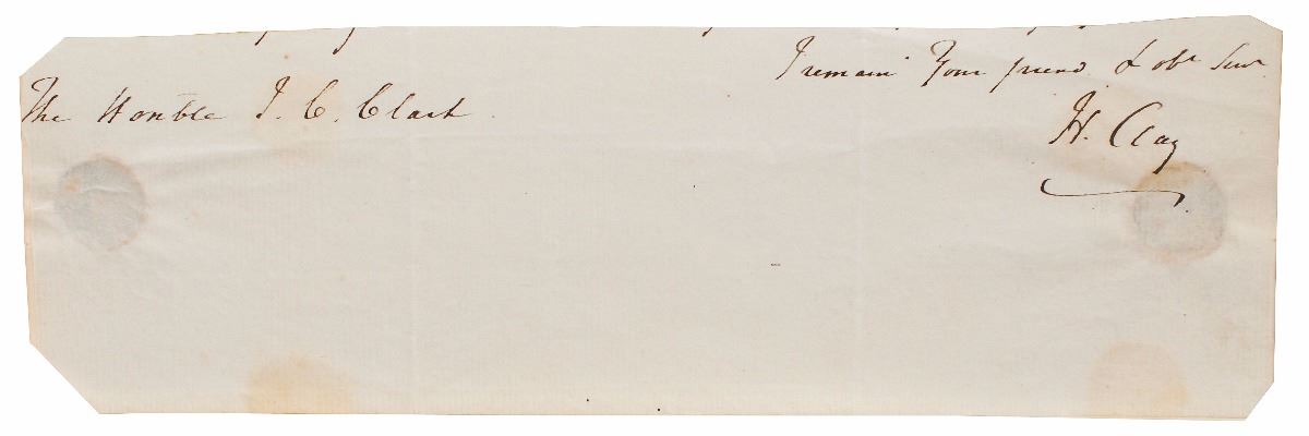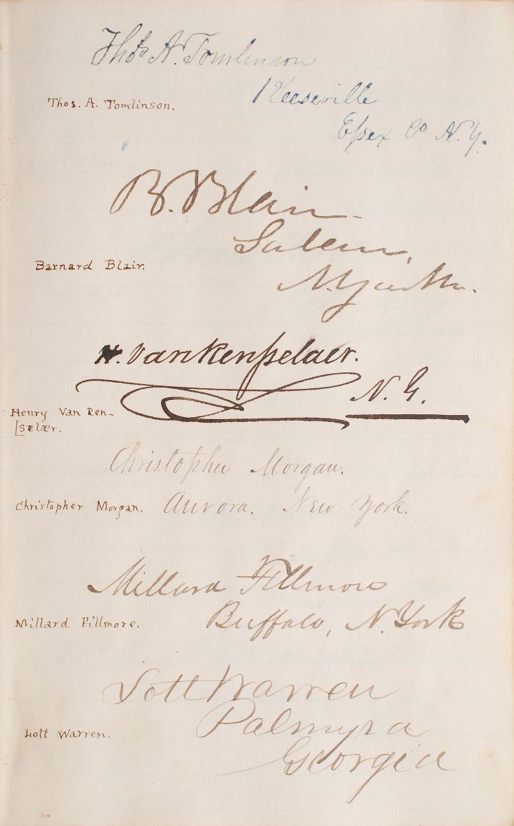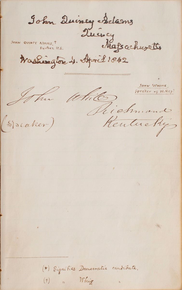 Softcover autograph book, 5 x 8, signed throughout by approximately 120 members of the 1840s US Congress, some signatures clipped and affixed, including: John Quincy Adams, Millard Fillmore, Henry Clay, Daniel Webster, John White, Joseph Trumbull, Caleb Cushing, Willie P. Mangum, William L. Dayton, Levi Woodbury, and others. In overall very good to fine condition.