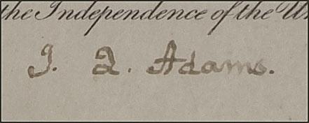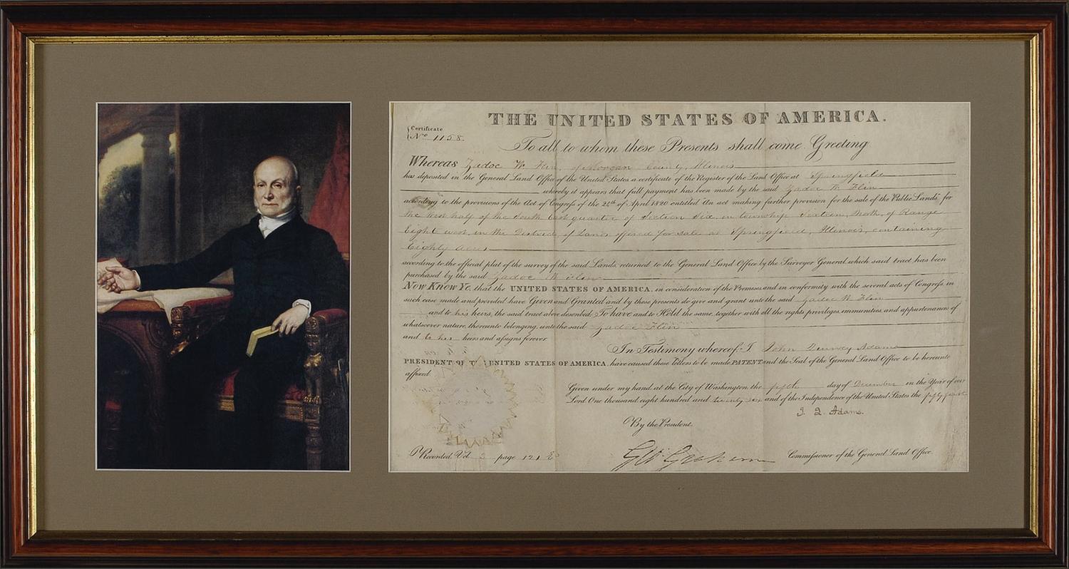Vellum DS as president, signed “J. Q. Adams,” one page, 14.75 x 9, December 5, 1826. President Adams authorizes the sale of eighty acres of land in Springfield, Illinois to Zadoe W. Flin of Morgan County, Illinois. The official seal is intact. Matted with a colorized seated portrait of Adams and framed to an overall size of 27.5 x 14.5. Heavy vertical folds, light creasing along the right side, and areas of toning and soiling, otherwise fine condition. Oversized.