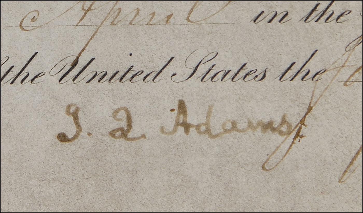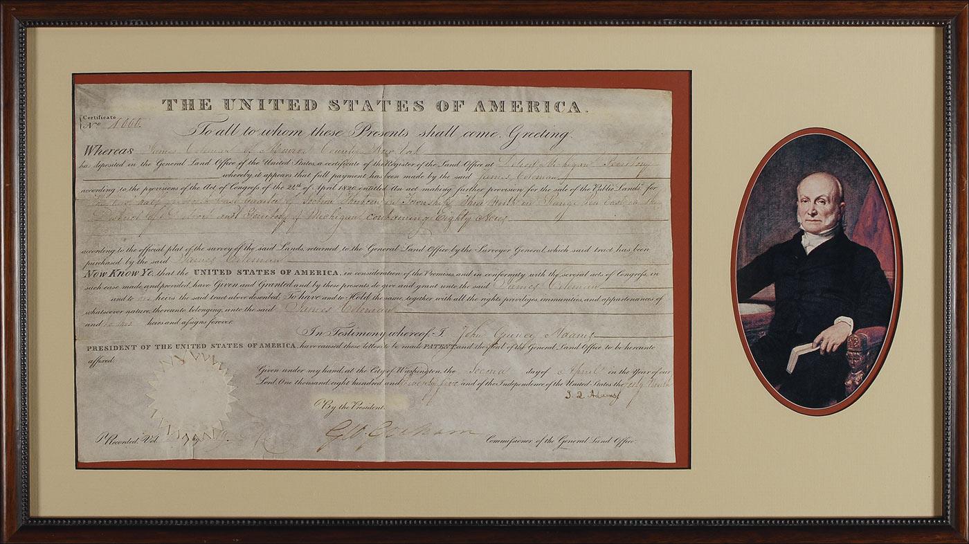 Partly-printed DS as president, signed “J. Q. Adams,” one page, 15 x 9.25, April 2, 1825. President Adams grants James Coleman 80 acres of land in the Michigan territory. Signed at the conclusion by Adams and countersigned by Commissioner of the General Land Office George Graham. Matted and framed with a color portrait of Adams, to an overall size of 24.5 x 14. In fine condition, with intersecting folds, and a bit of scattered light toning and soiling. The white seal is intact. Oversized.