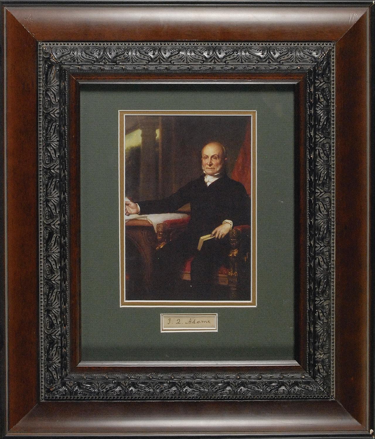 Ink signature, “J. Q. Adams,” on an off-white 2 x .5 slip. Double-matted with a colorized portrait and framed to an overall size of 13.5 x 15.5. Light soiling and a few light creases affecting last name, otherwise fine condition.