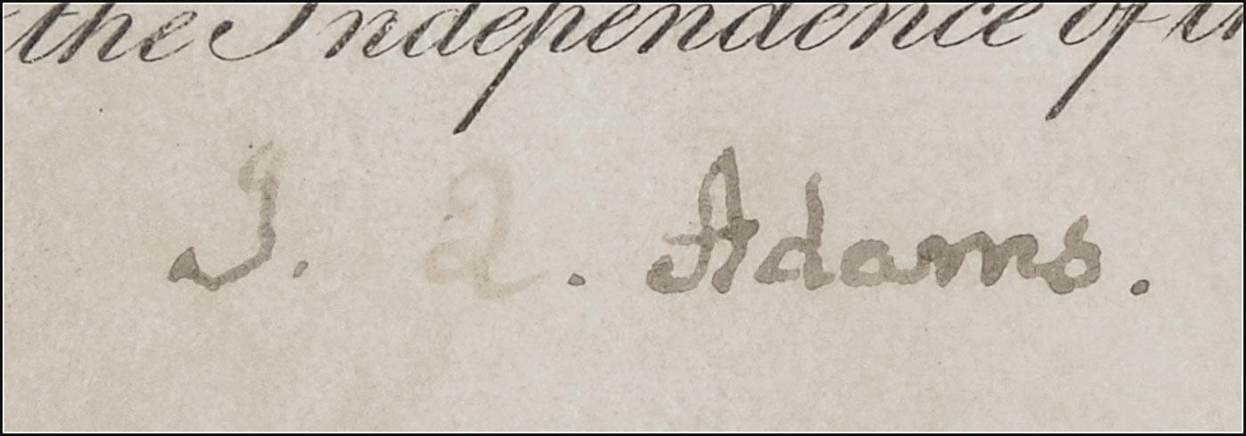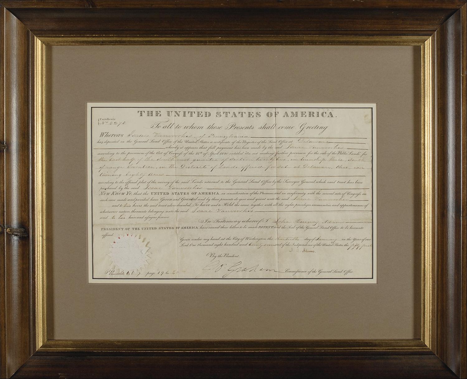 Partly printed DS as president, signed “J. Q. Adams,” one page on vellum, 14.5 x 9, January 30, 1827. A grant for a parcel of land in Delaware, Ohio issued to Isaac Van Voorhis. Signed at the conclusion by Adams, and countersigned by Commissioner of the General land Office George Graham. Matted and framed to an overall size of 20.25 x 24. Intersecting folds, typical wrinkling, and “J. Q.” a shade lighter than “Adams” (but fully legible), otherwise fine condition. The embossed paper seal is worn, but intact. Oversized.