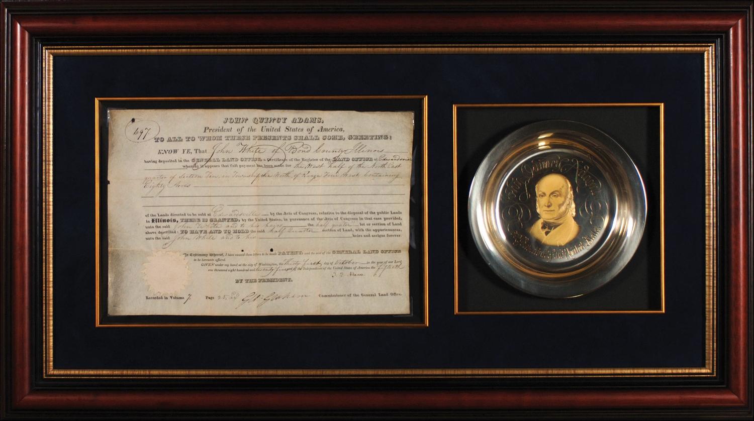 Partly-printed DS, as president, one page, 13.5 x 9.5, October 31, 1825. Adams grants 80 acres of land in Edwardsville, Illinois to John White. Sigend at the conclusion by Adams, and countersigned by the Commissioner of the General Land Office George Graham. Archivally shadow box framed with a gold-inlaid, sterling silver portrait plate issued in a limited edition by the Franklin Mint in the early-to-mid 1970s to an overall size of 34 x 19. In very good to fine condition, with some light toning and soiling, expected folds, and a couple of small holes, not affecting text. White wafer seal is worn, but intact.