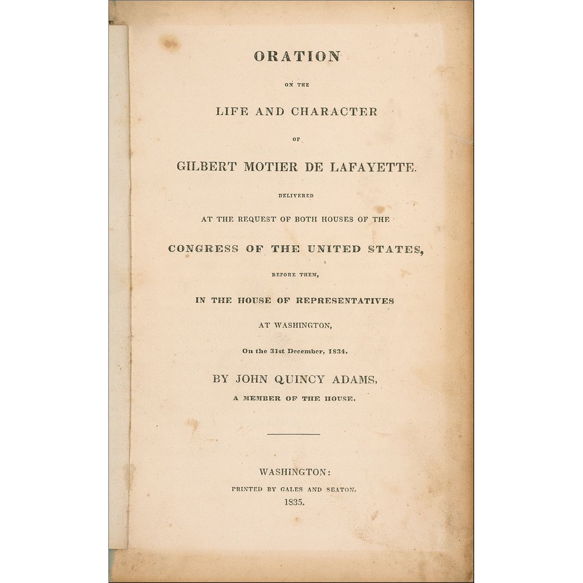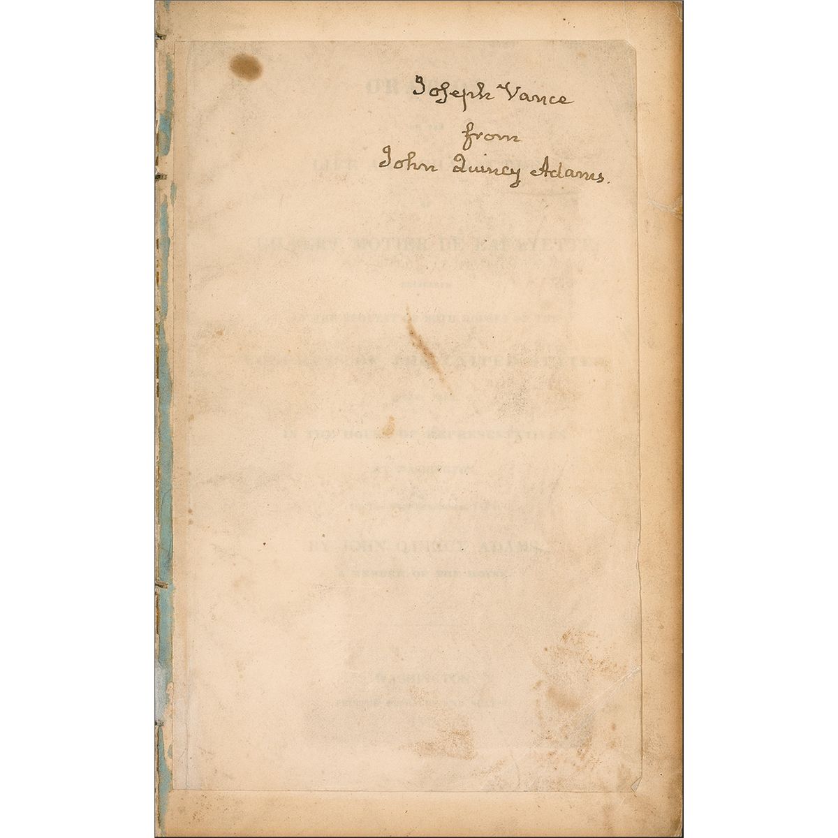Signed book: Oration on the Life and Character of Gilbert Motier de Lafayette. Washington: Gales and Seaton, 1835. Hardcover, 5.5 x 9, 94 pages. Signed and inscribed on a 5 x 7.75 off-white page, “Joseph Vance from John Quincy Adams,” neatly affixed by its extreme left edge to the book’s title page. As was customary at the time, no doubt due to his advanced age and physical limitations, Adams penned the inscription on a separate page and then had the recipient insert the page into an appropriate volume. In good condition, with missing cover and spine (back cover is present but detached), soiling and creasing to signed page, scattered toning to remaining pages, fragile binding, small tears to opening and closing pages, and staining to fore-edges. Book is housed in a custom clamshell box.