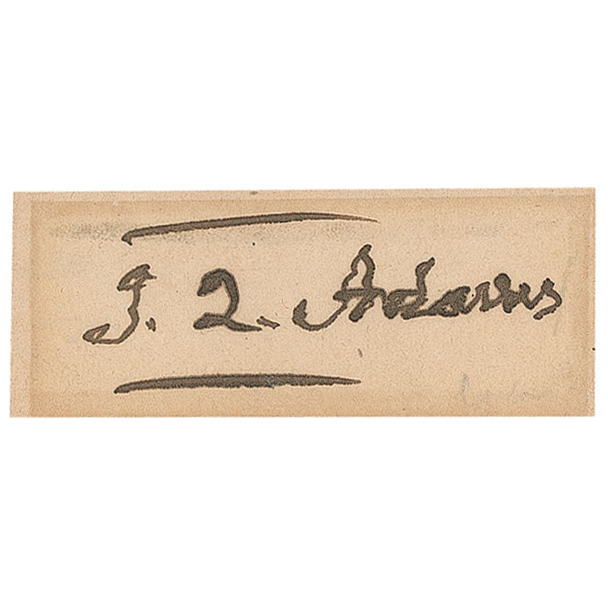 Bold ink signature, “J. Q. Adams,” on an off-white 2 x .75 slip which has been inlaid to a 4.5 x 1.5 off-white slip. In fine condition, with a uniform block of toning over signature.